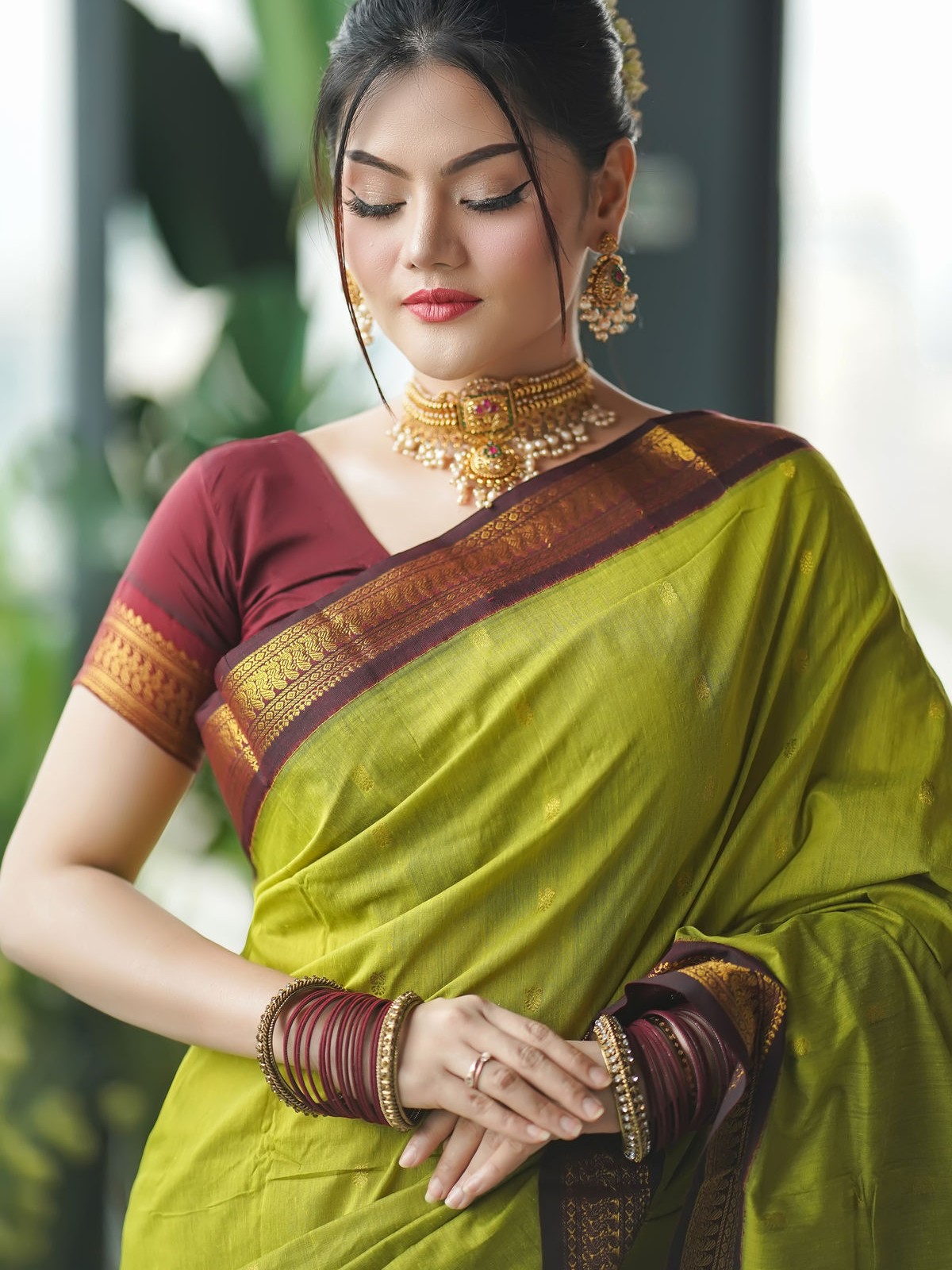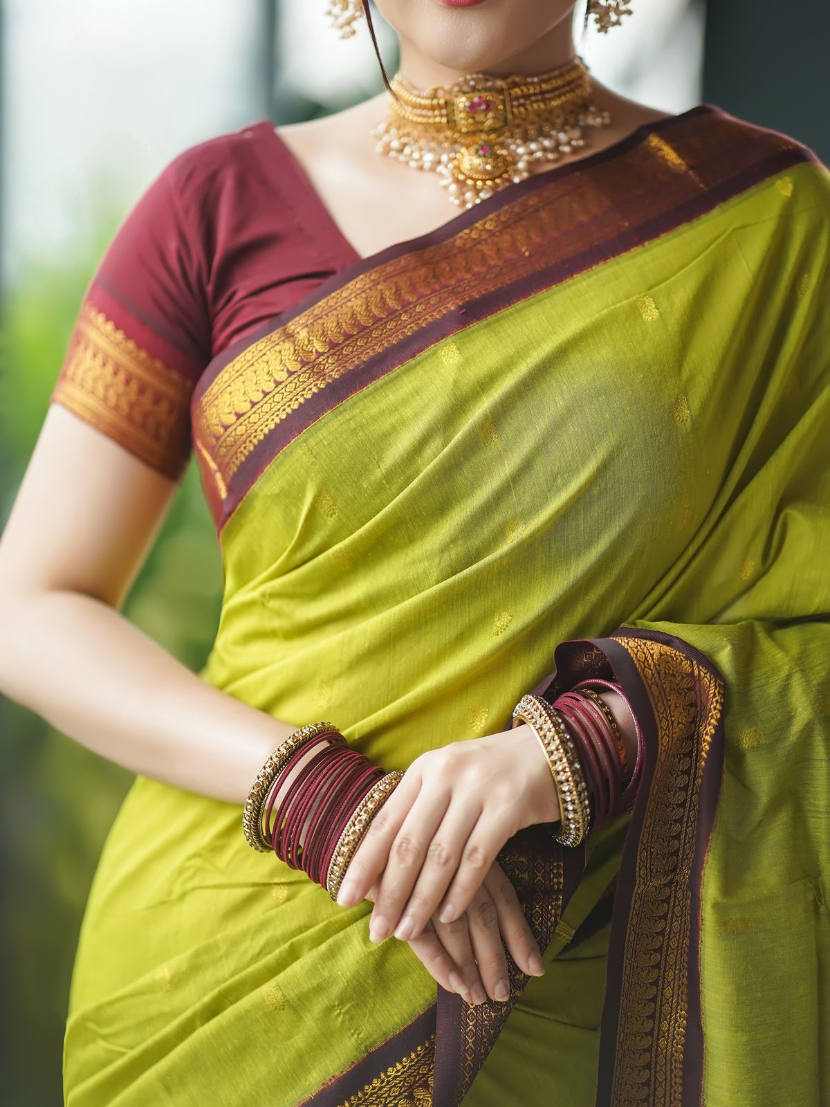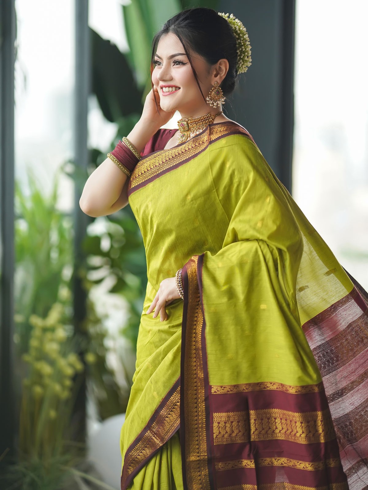 Refresh your style with our Inspired Gadwal Half Silk Saree in Parrot Green, a perfect choice for women who love to blend elegance with vibrance. Crafted from a premium half-silk fabric, this saree delivers the breathable comfort of cotton while giving you the radiant sheen of silk. The lively parrot green shade adds a touch of freshness and charm, making it an eye-catching outfit for cultural gatherings, festive occasions, and sophisticated office wear.