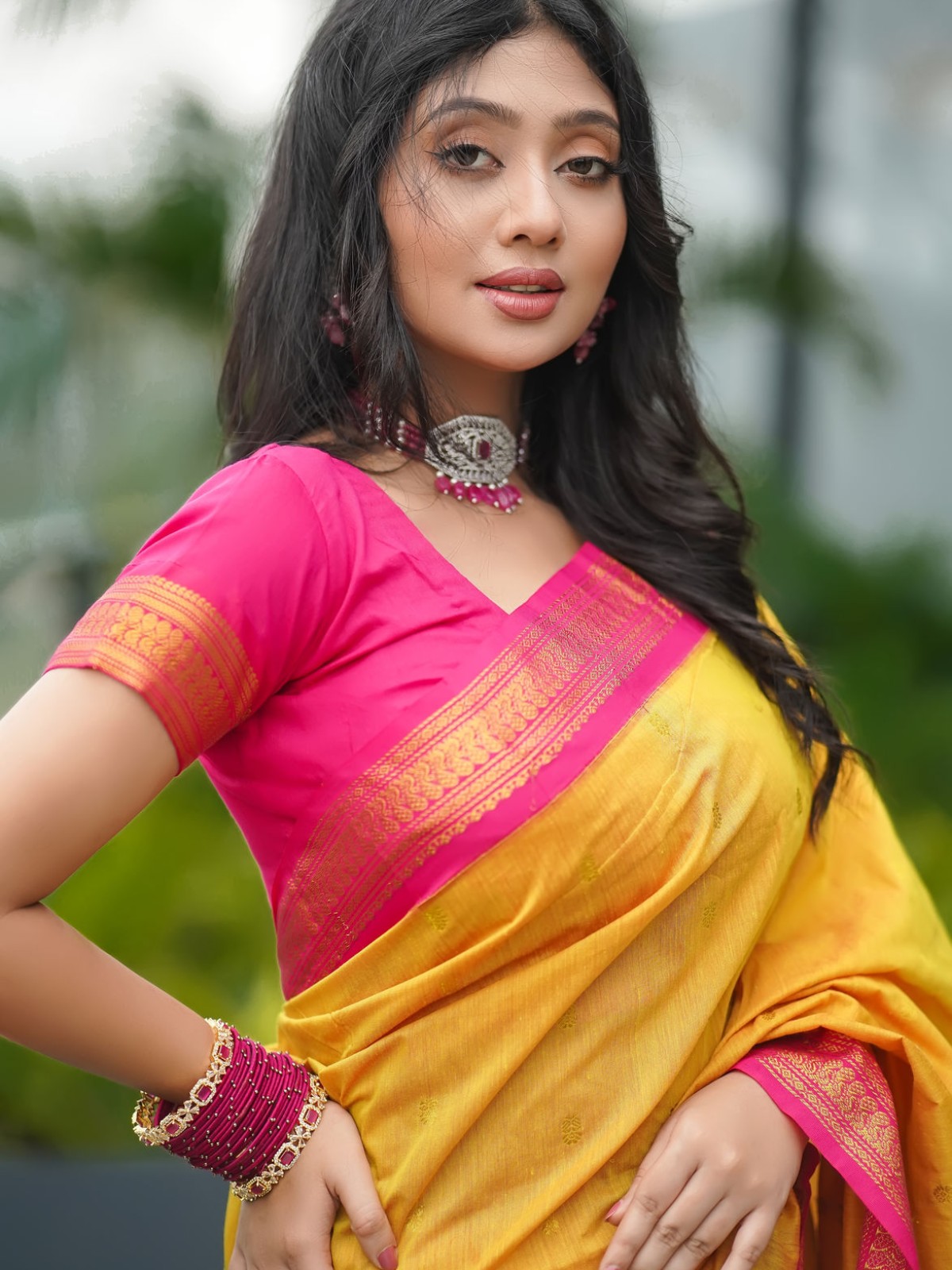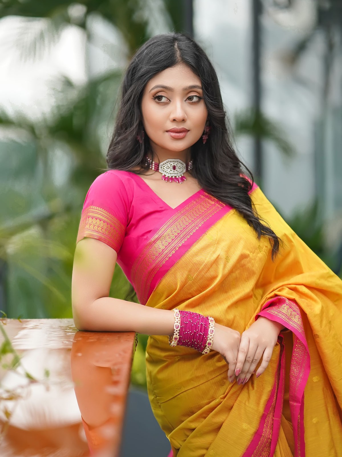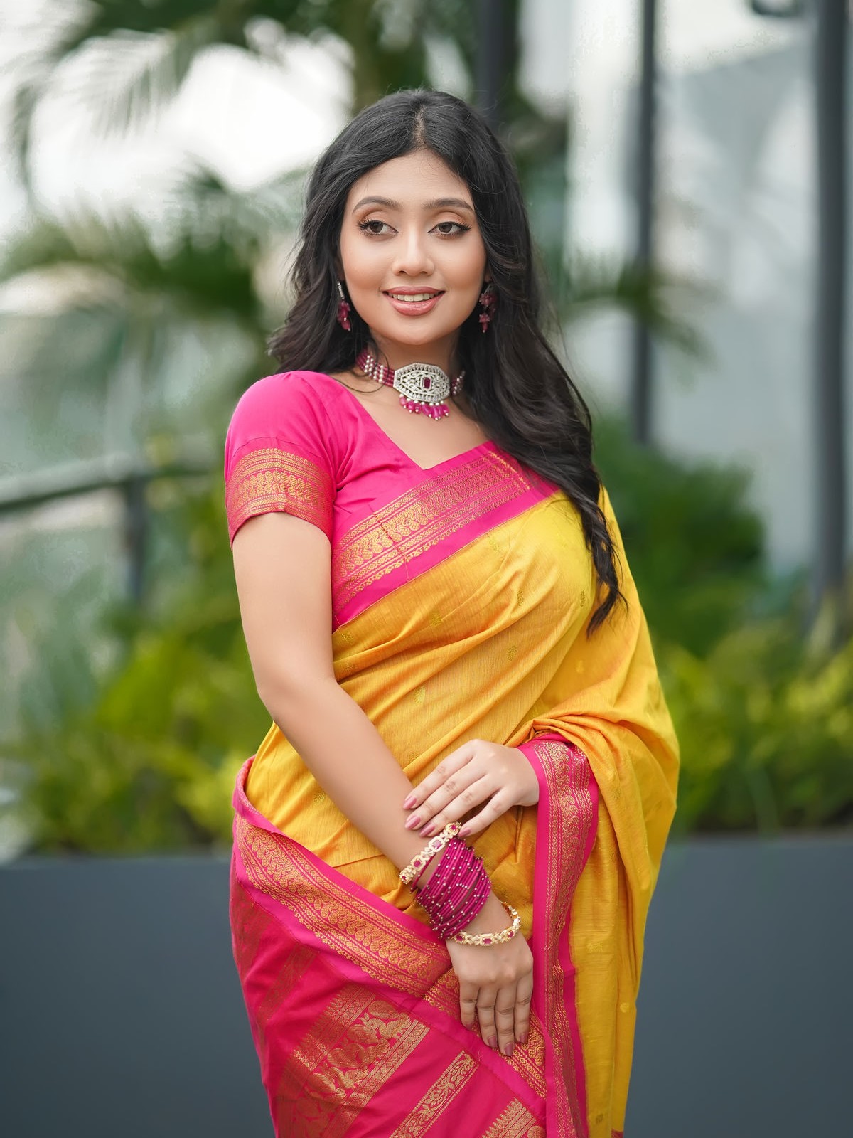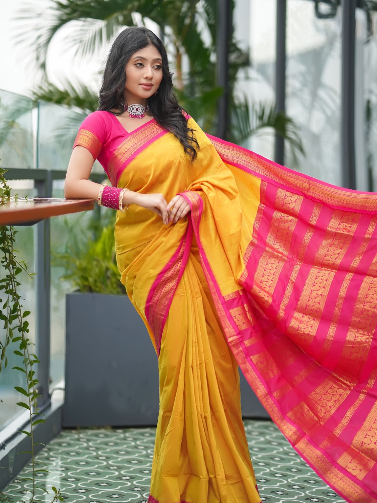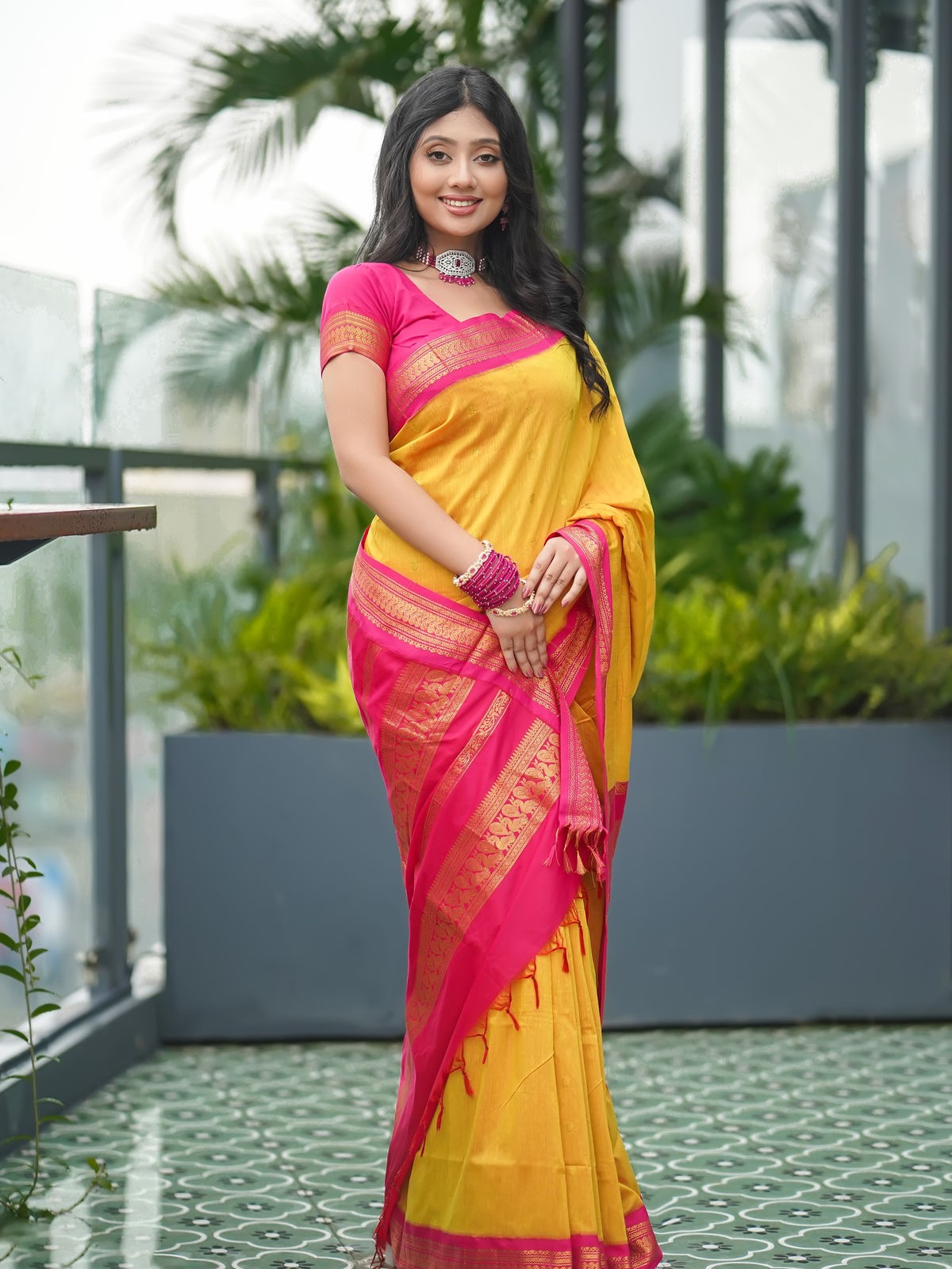 Add a radiant charm to your wardrobe with our Inspired Gadwal Half Silk Saree in Yellow. Designed for women who love elegance with a cheerful touch, this saree combines tradition and modern fashion effortlessly. Made from premium half-silk fabric, it offers the breathable comfort of cotton with the luxurious glow of silk. The vibrant yellow shade symbolizes joy, positivity, and celebration. It's an ideal choice for festive occasions, cultural events, and graceful office wear.