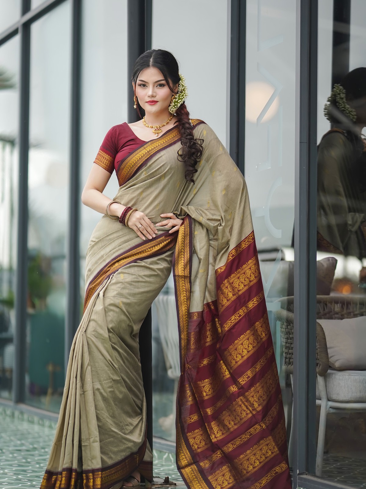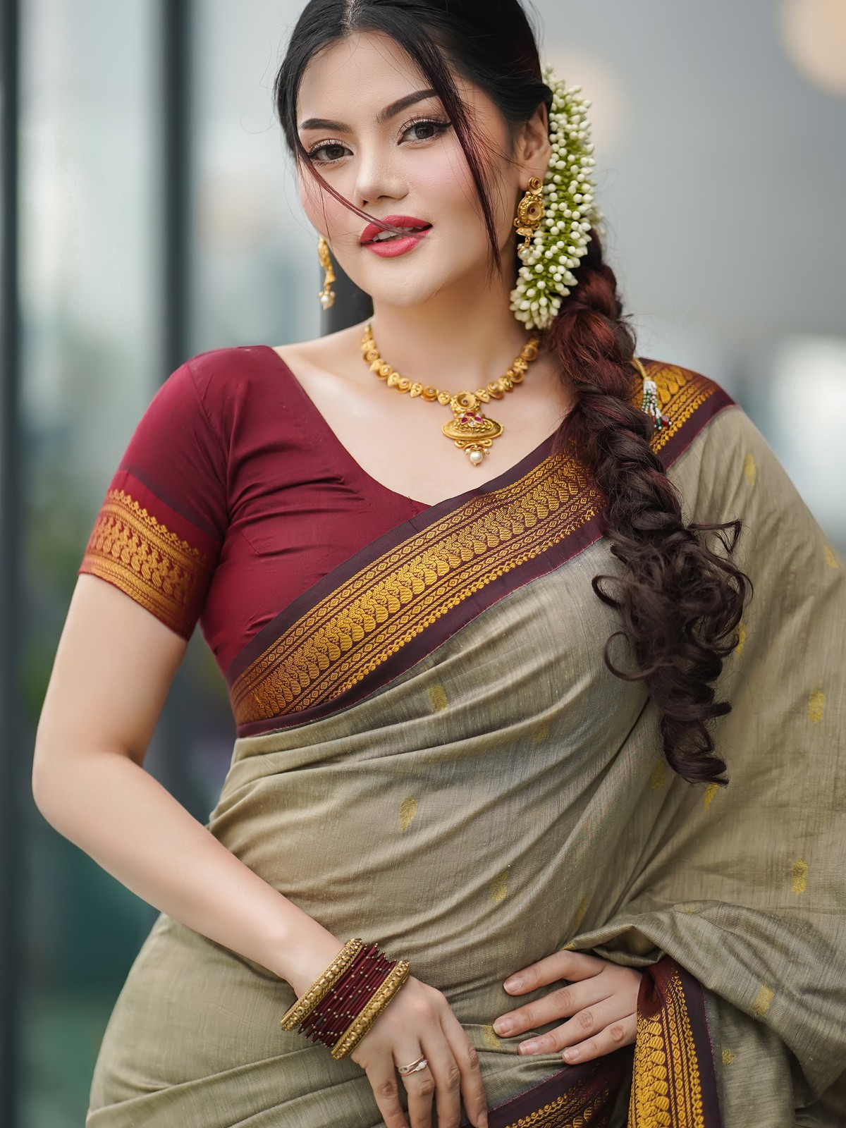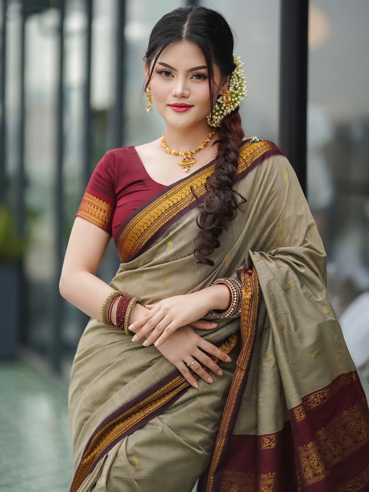 Redefine subtle sophistication with our Inspired Gadwal Half Silk Saree in Ash Color. This saree is designed for women who appreciate elegance in understated tones. Made from premium half-silk fabric, it offers the soft breathability of cotton with the graceful shine of silk. The versatile ash shade exudes calmness and charm, making it a timeless choice for cultural programs, office wear, and festive occasions.