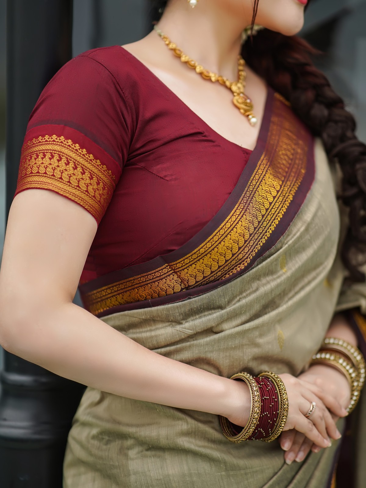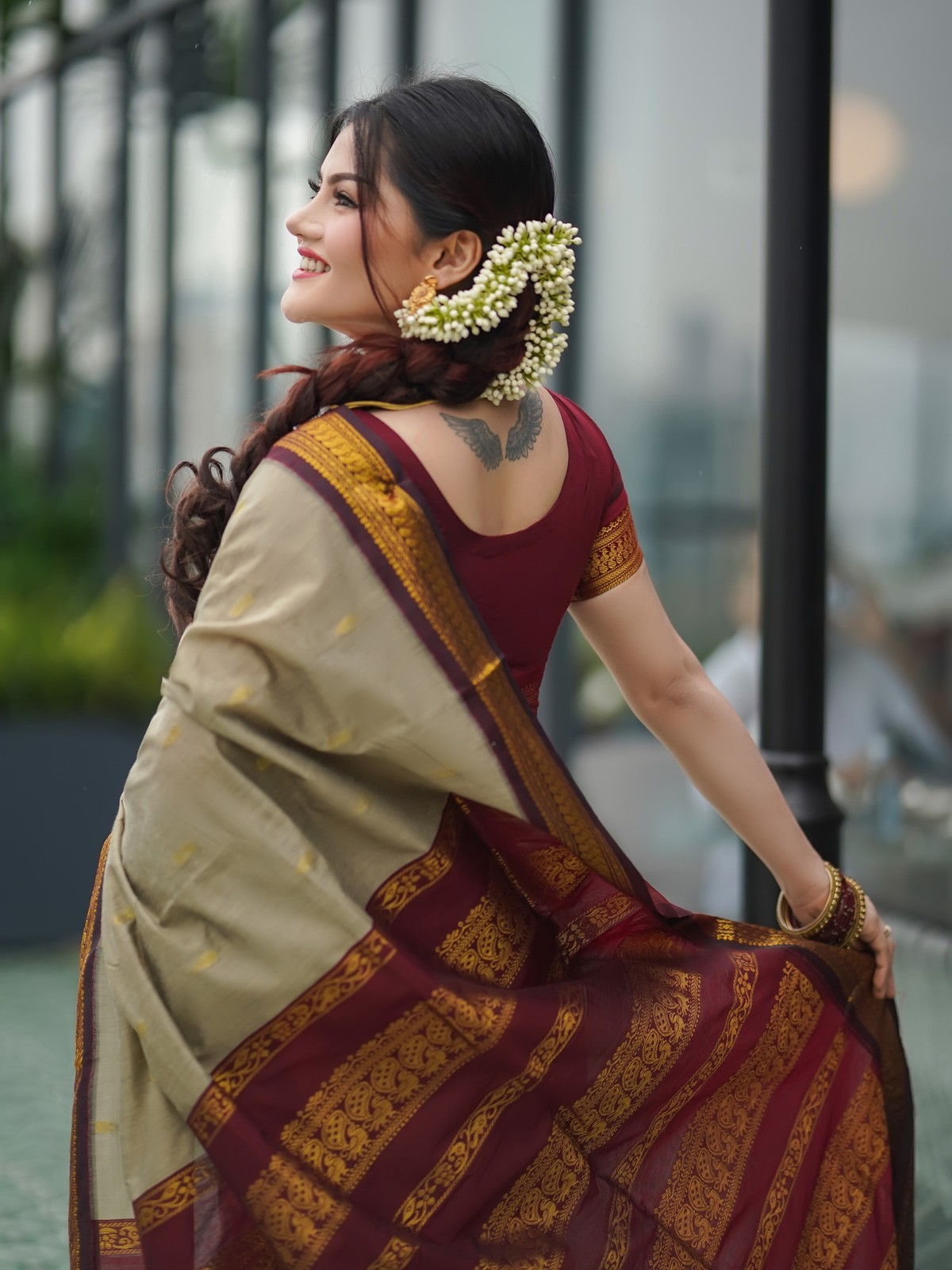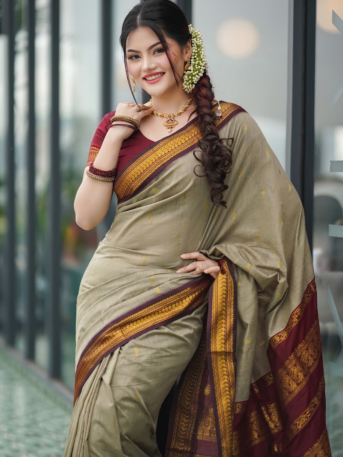 Redefine subtle sophistication with our Inspired Gadwal Half Silk Saree in Ash Color. This saree is designed for women who appreciate elegance in understated tones. Made from premium half-silk fabric, it offers the soft breathability of cotton with the graceful shine of silk. The versatile ash shade exudes calmness and charm, making it a timeless choice for cultural programs, office wear, and festive occasions.