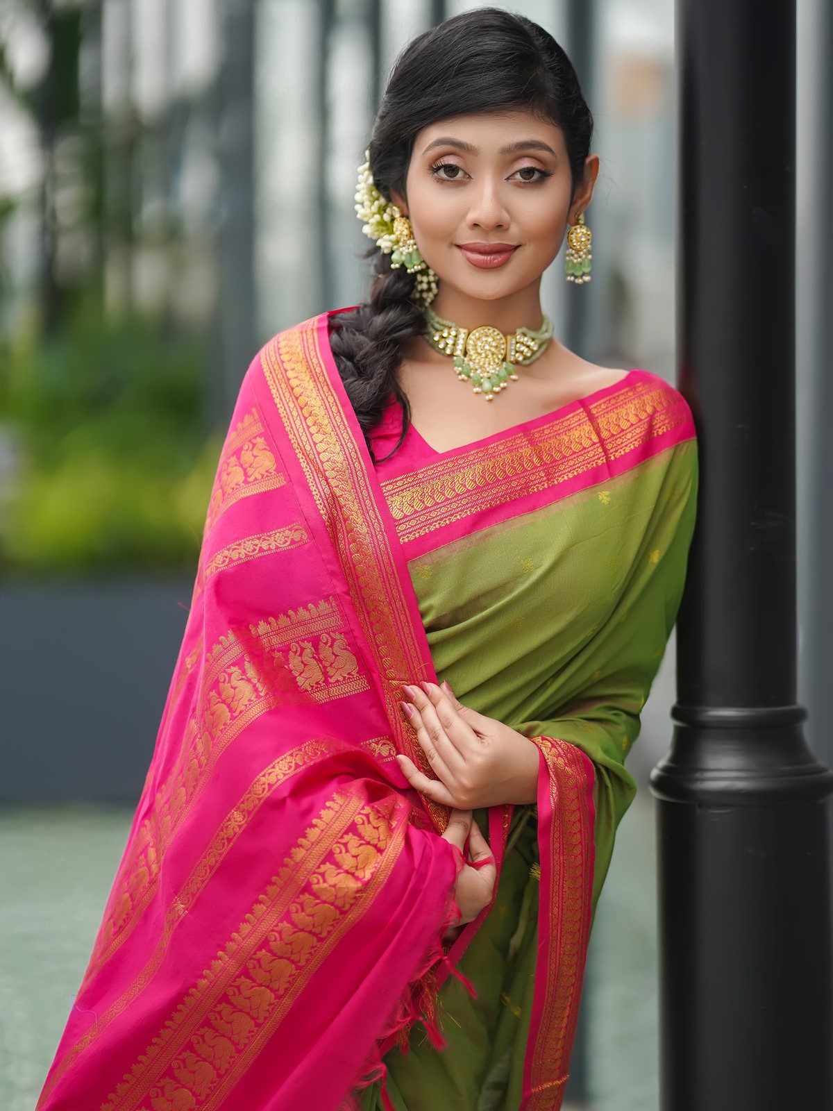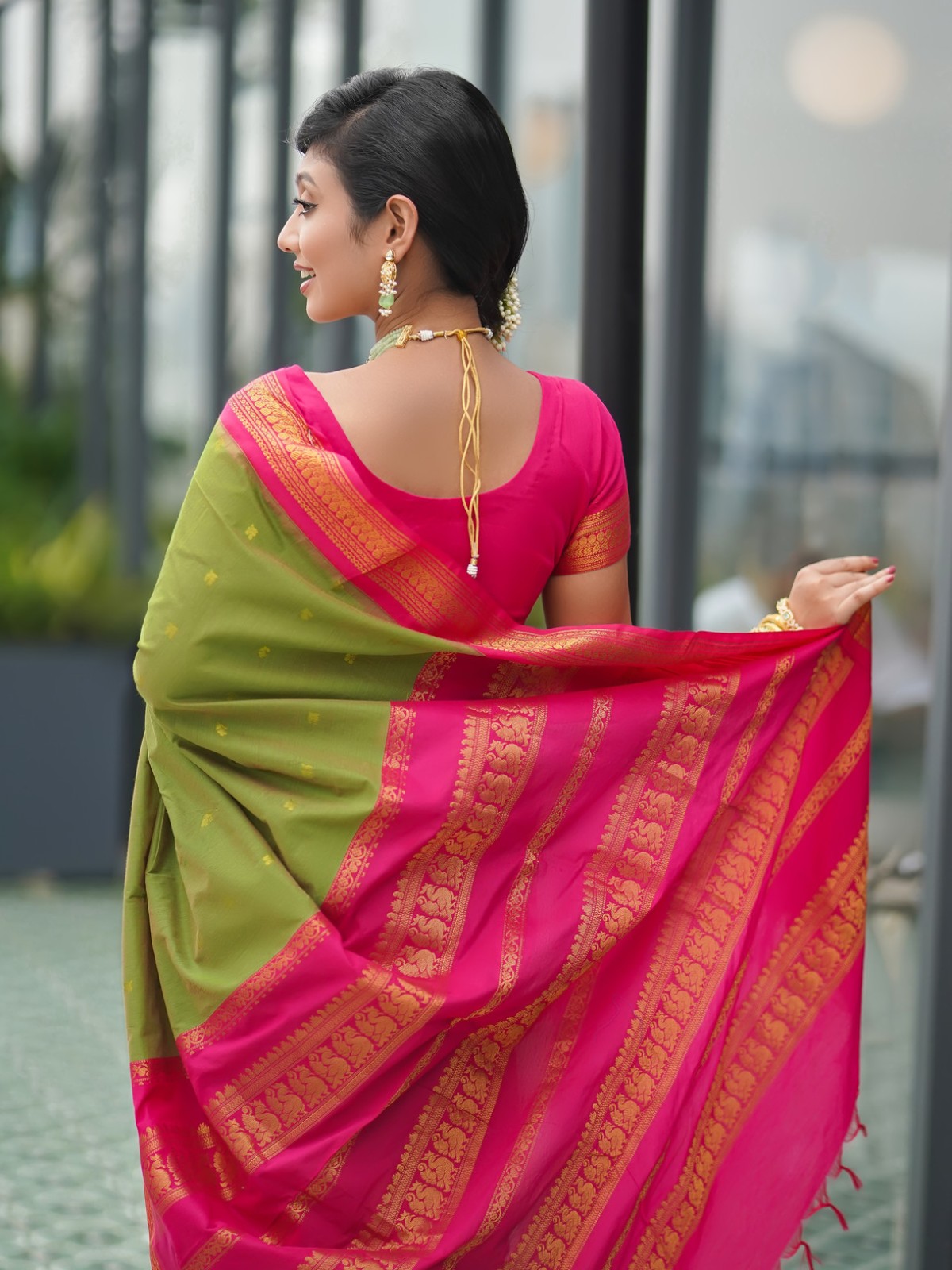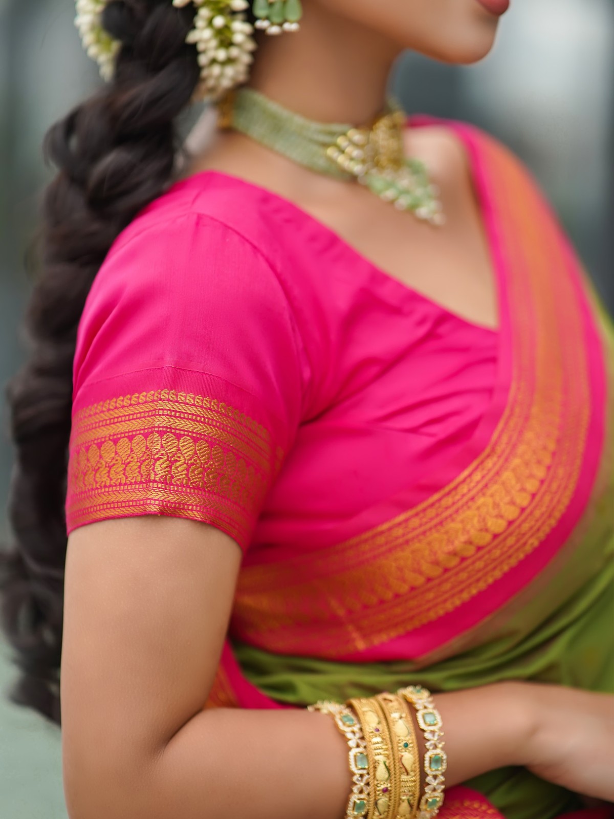 Step into vibrant elegance with our Inspired Gadwal Half Silk Saree in Parrot Green. Crafted from premium half-silk fabric, this saree combines the br...