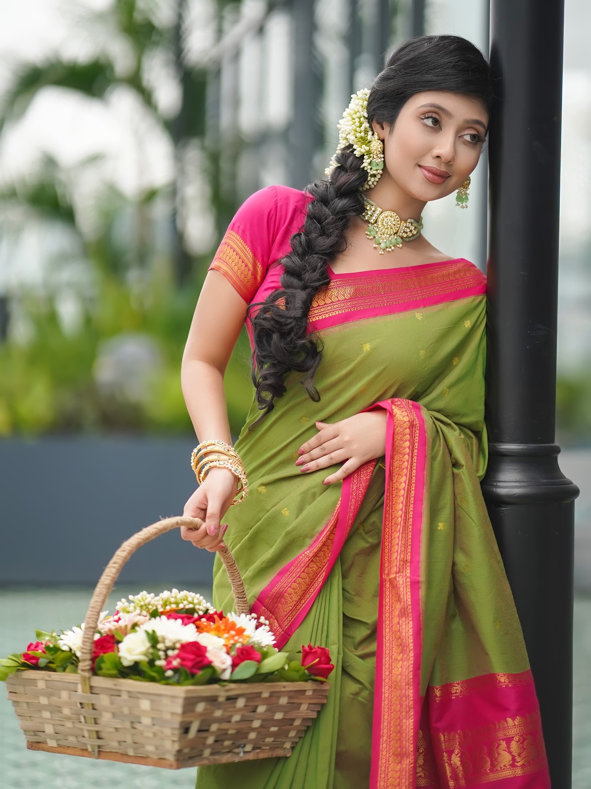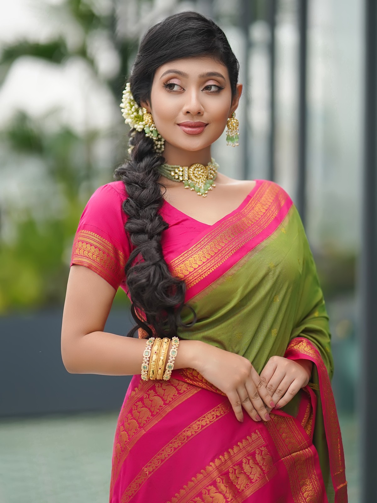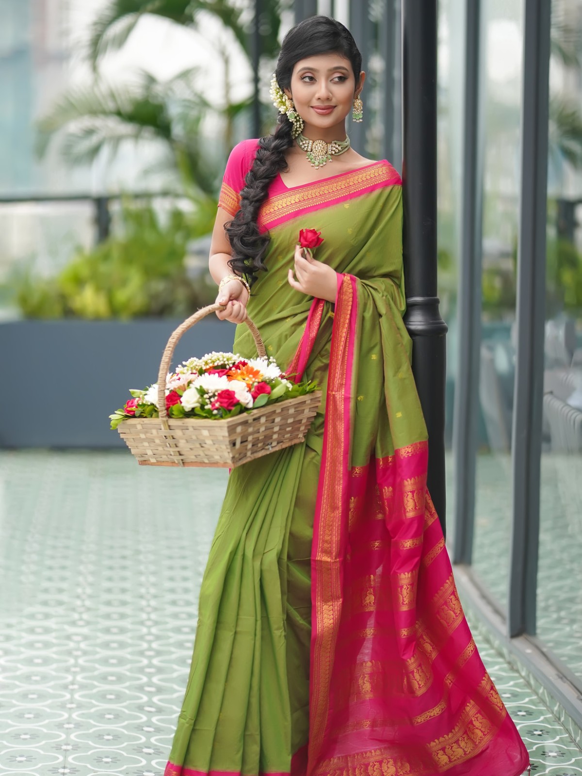 Step into vibrant elegance with our Inspired Gadwal Half Silk Saree in Parrot Green. Crafted from premium half-silk fabric, this saree combines the br...