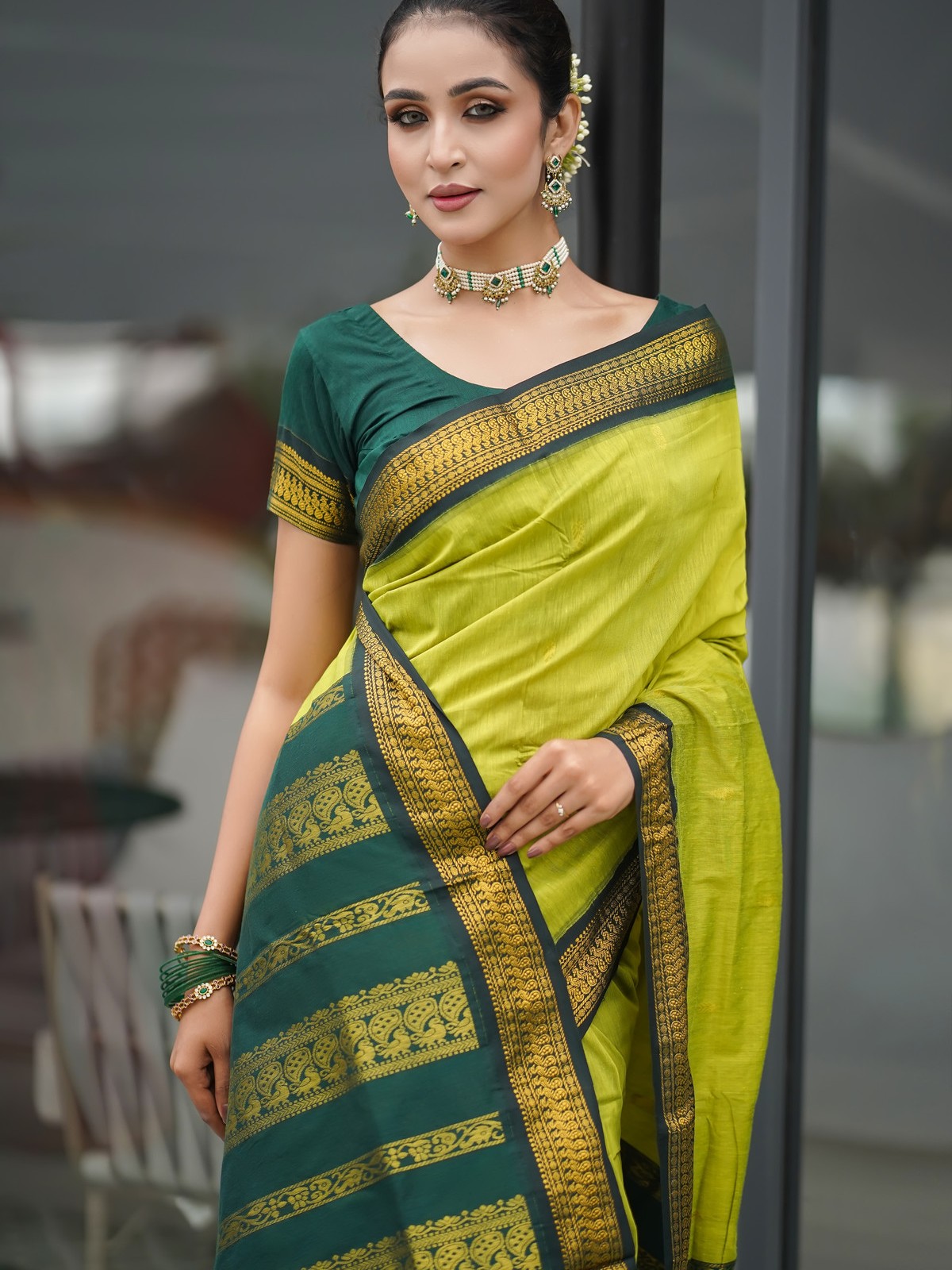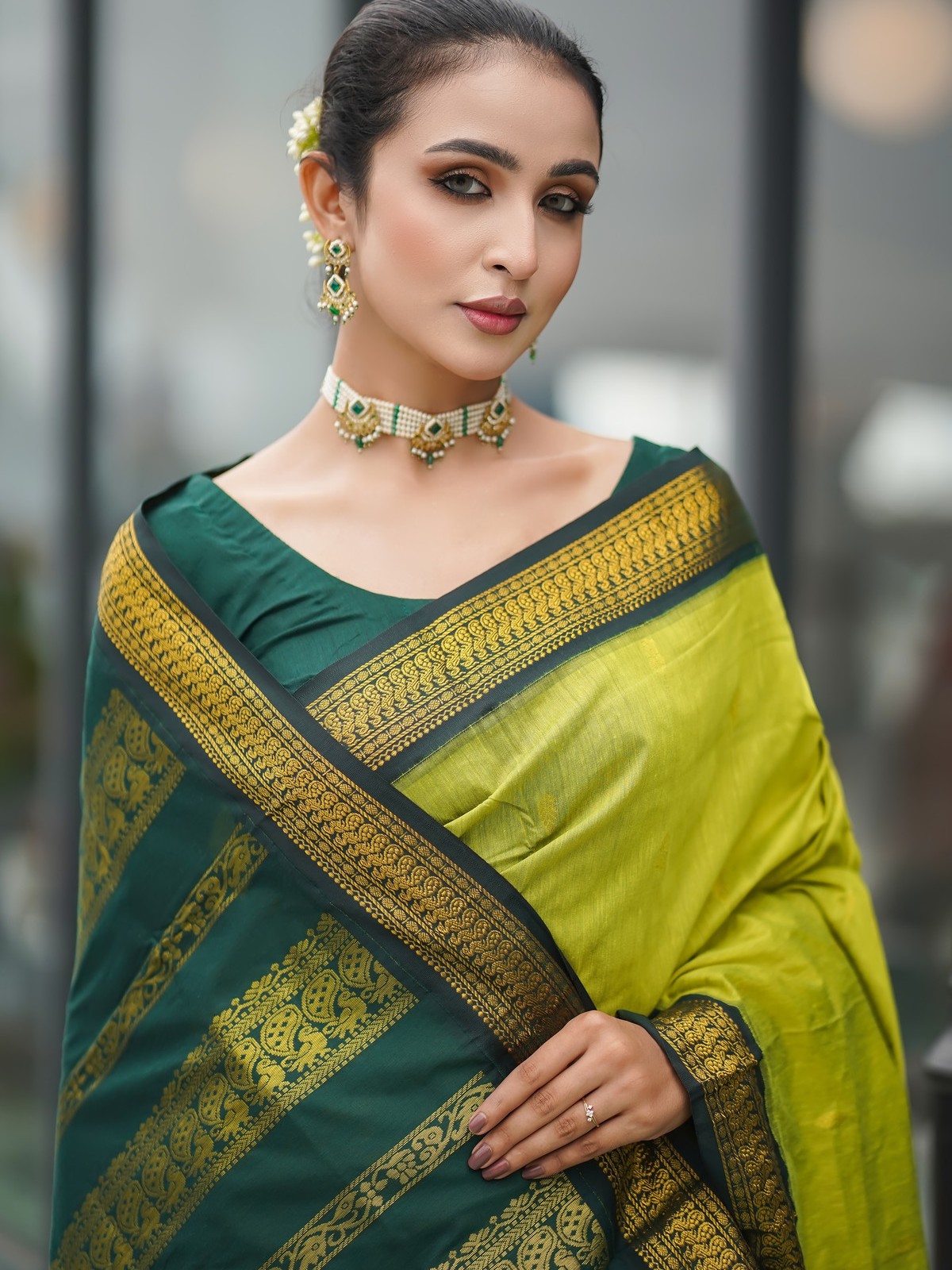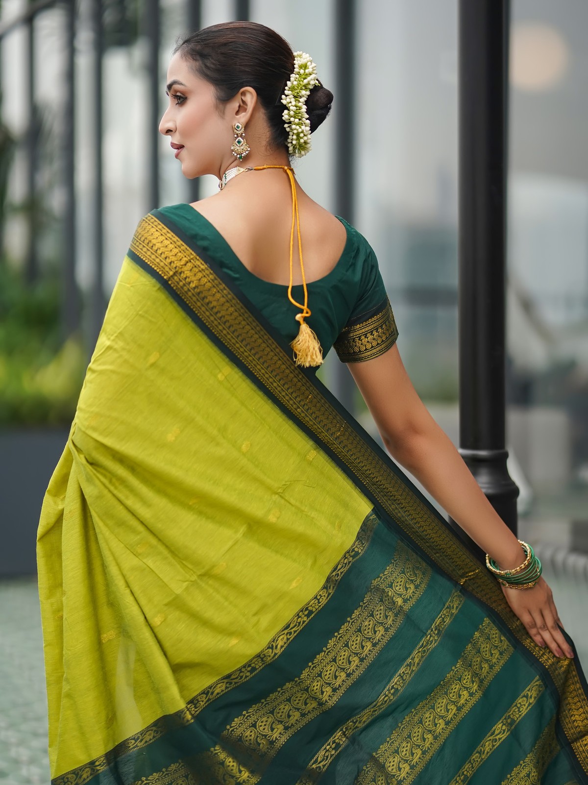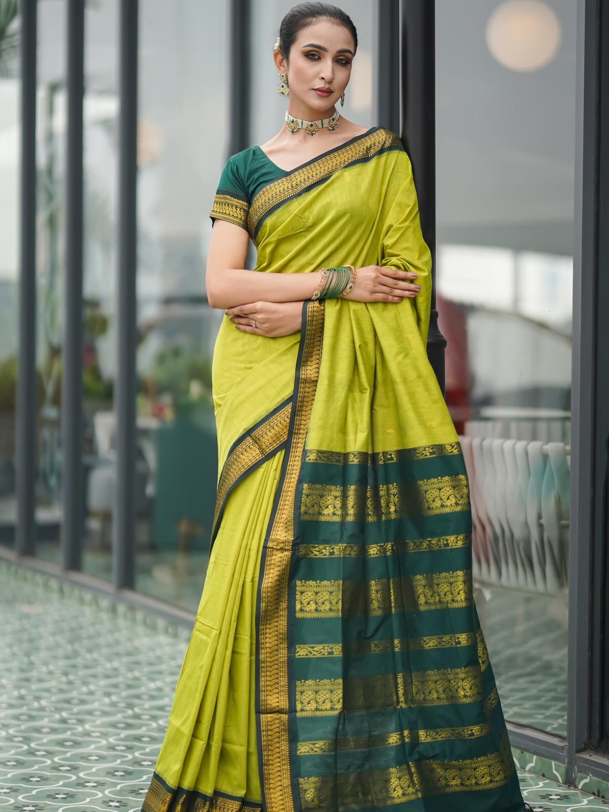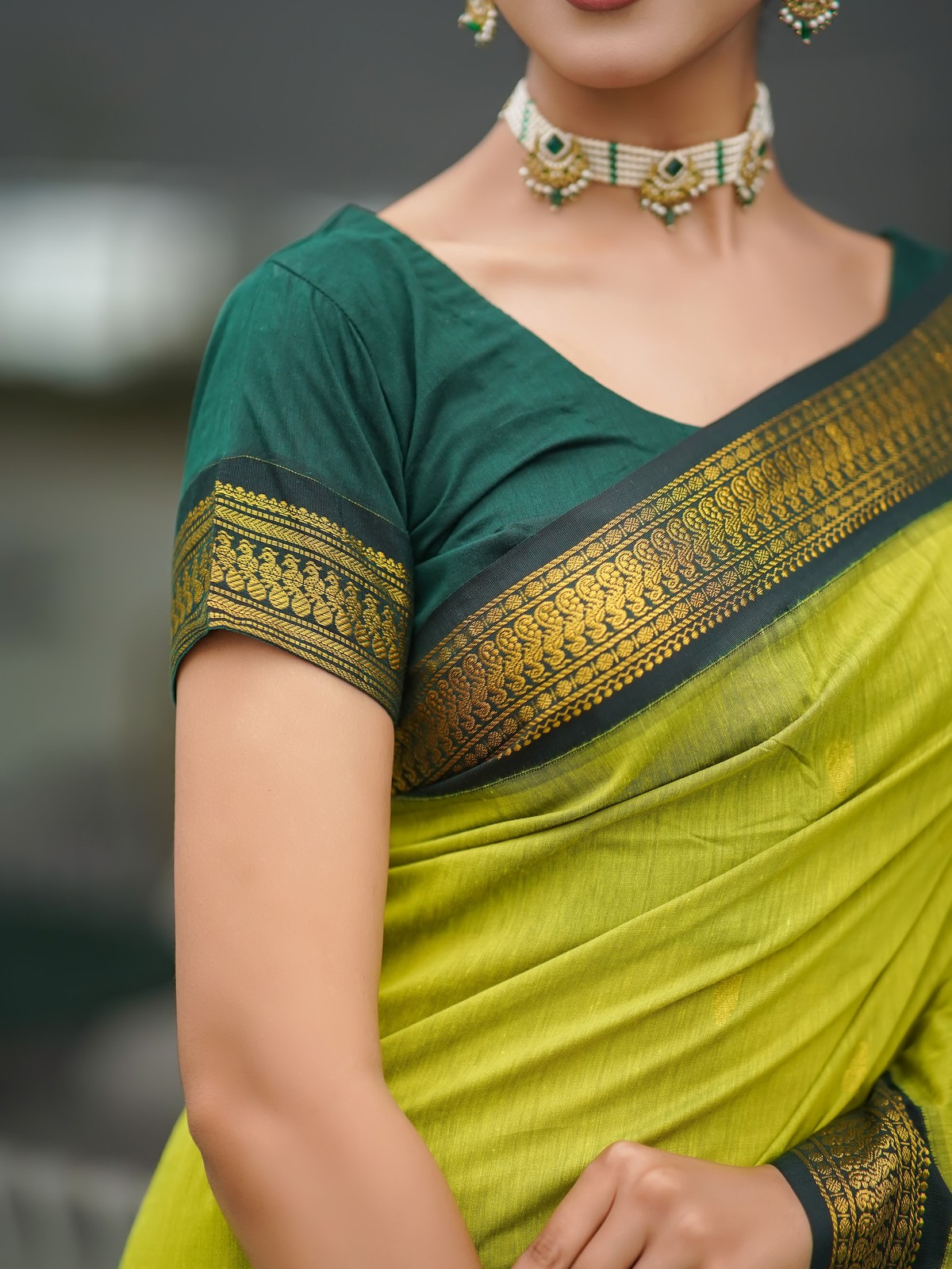 Step into vibrant elegance with our Inspired Gadwal Half Silk Saree in Parrot Green. Crafted from premium half-silk fabric, this saree combines the breathable comfort of cotton with the luxurious sheen of silk. Its lively parrot green hue adds a refreshing and cheerful charm, making it perfect for festive events, cultural gatherings, and stylish office wear.