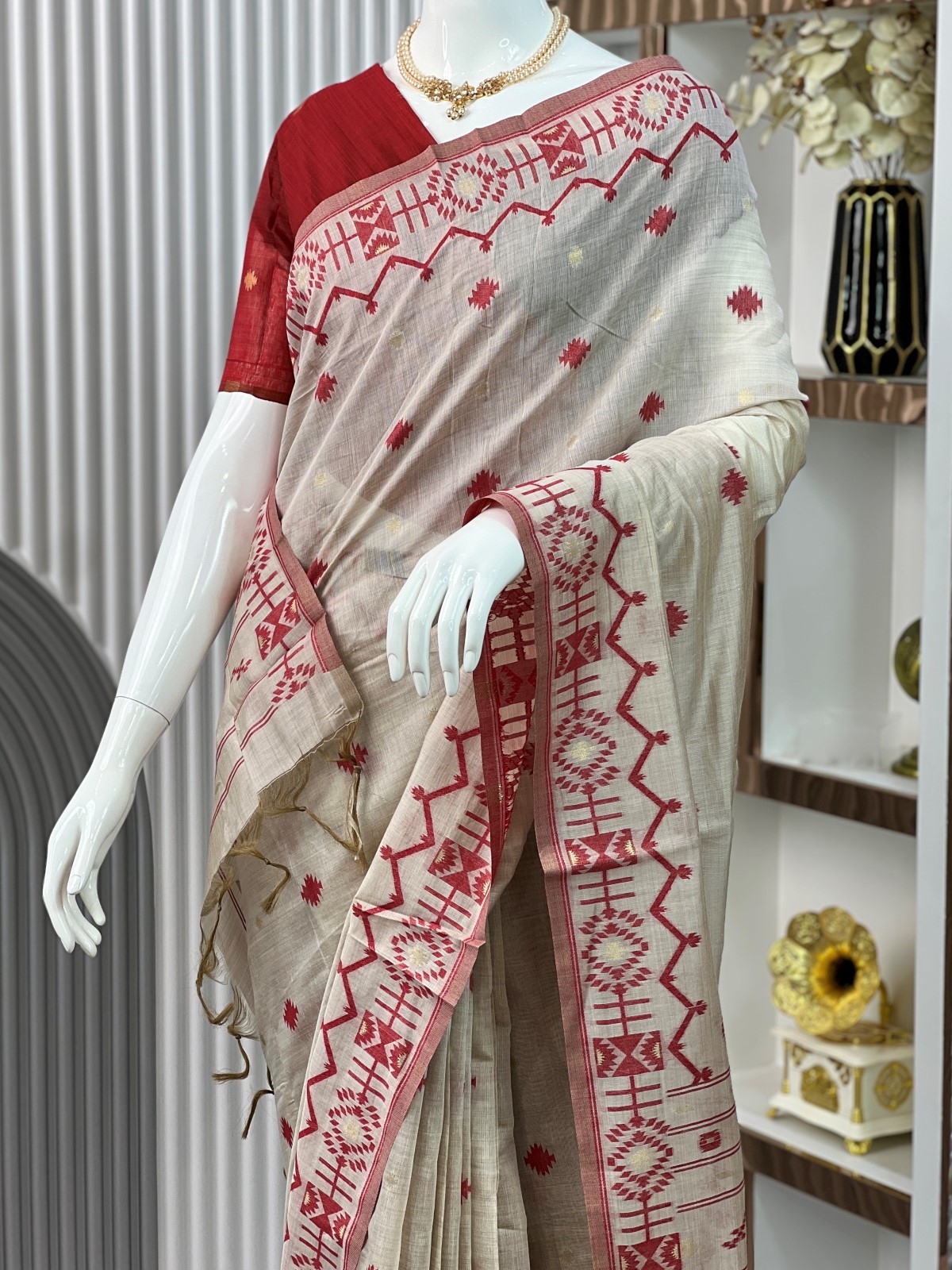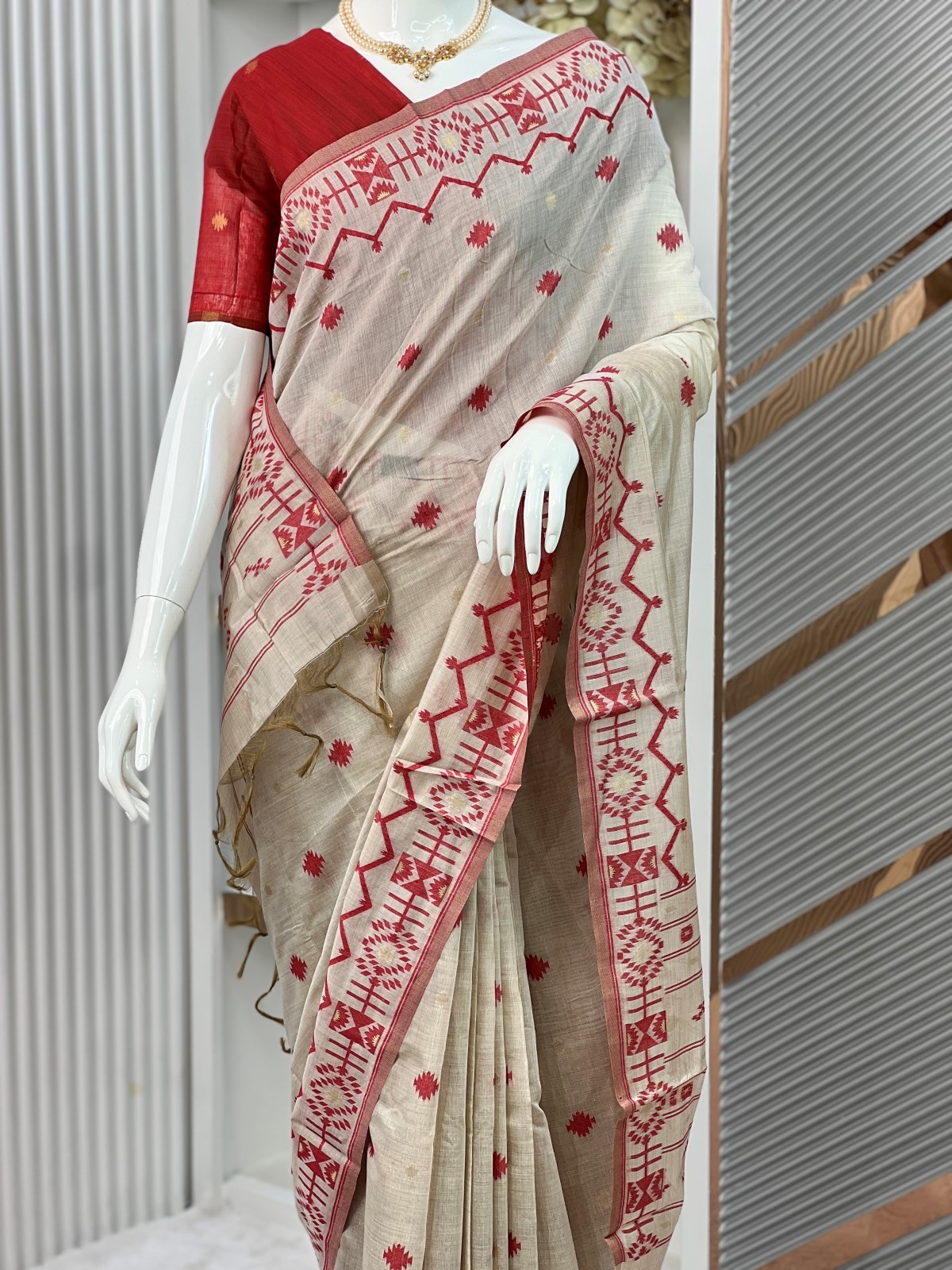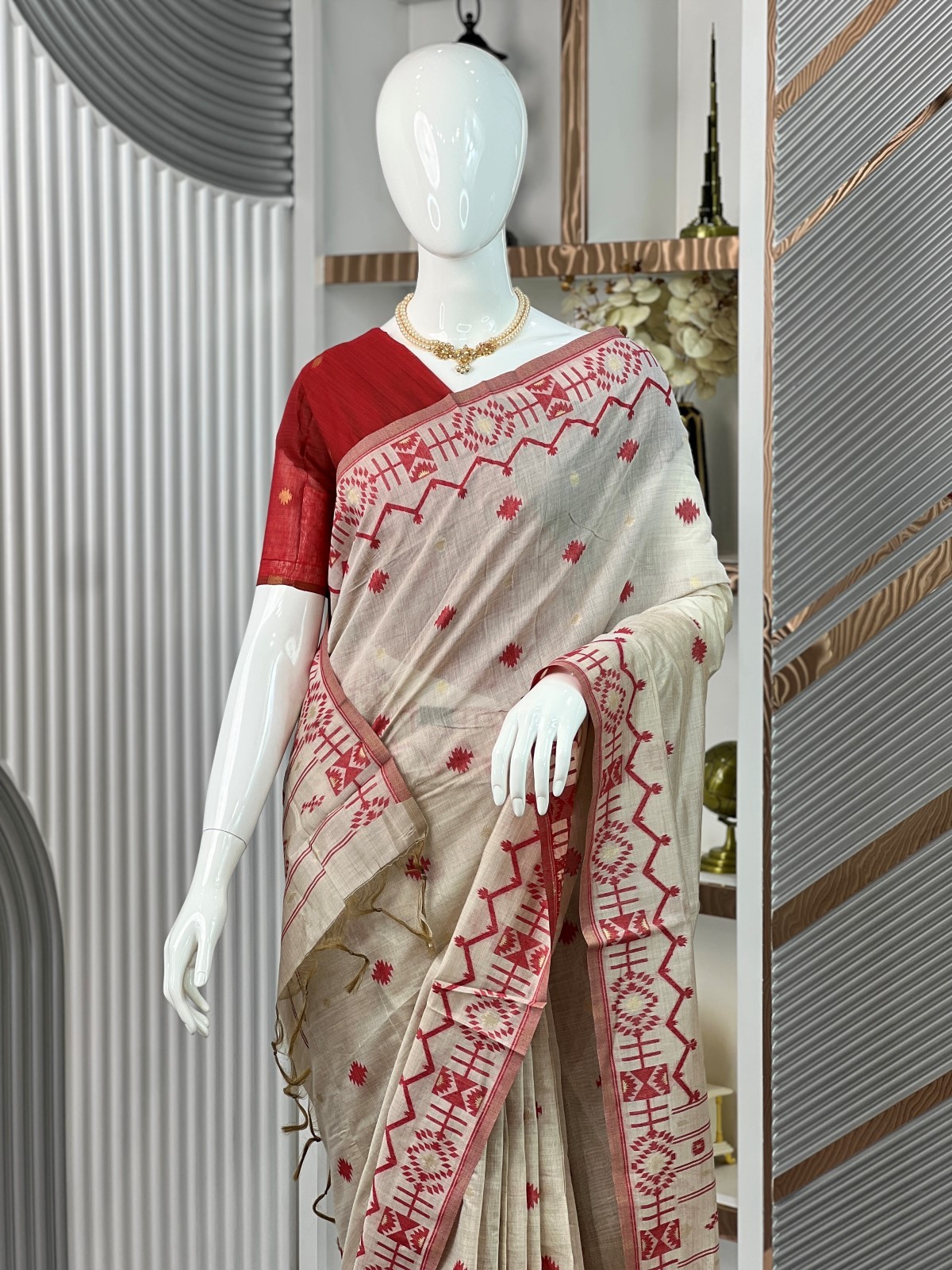 Woven with care and tradition, this saree blends the timeless charm of Jamdani design with the breathability of linen fabric. Lightweight and elegant, it’s ideal for day-long wear, whether it’s a cultural program, festive gathering, or office event. Comes with a matching blouse piece for a complete, refined look.