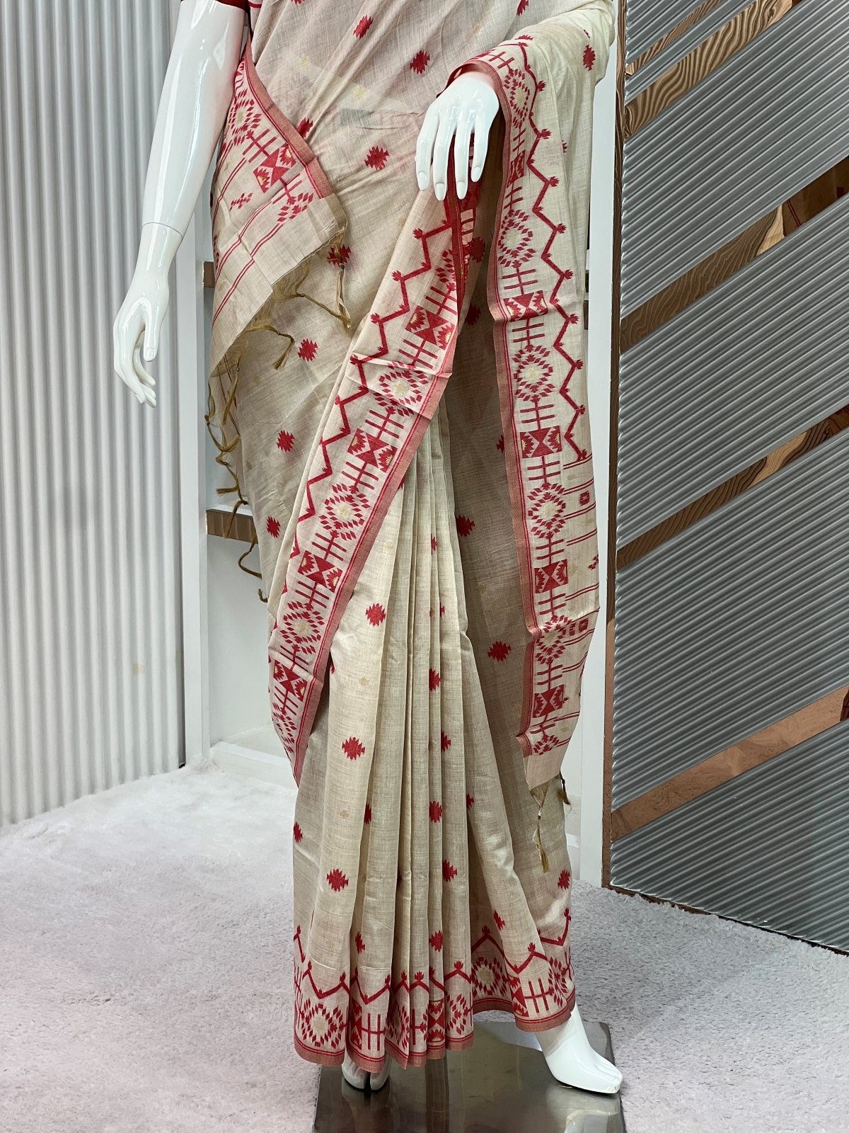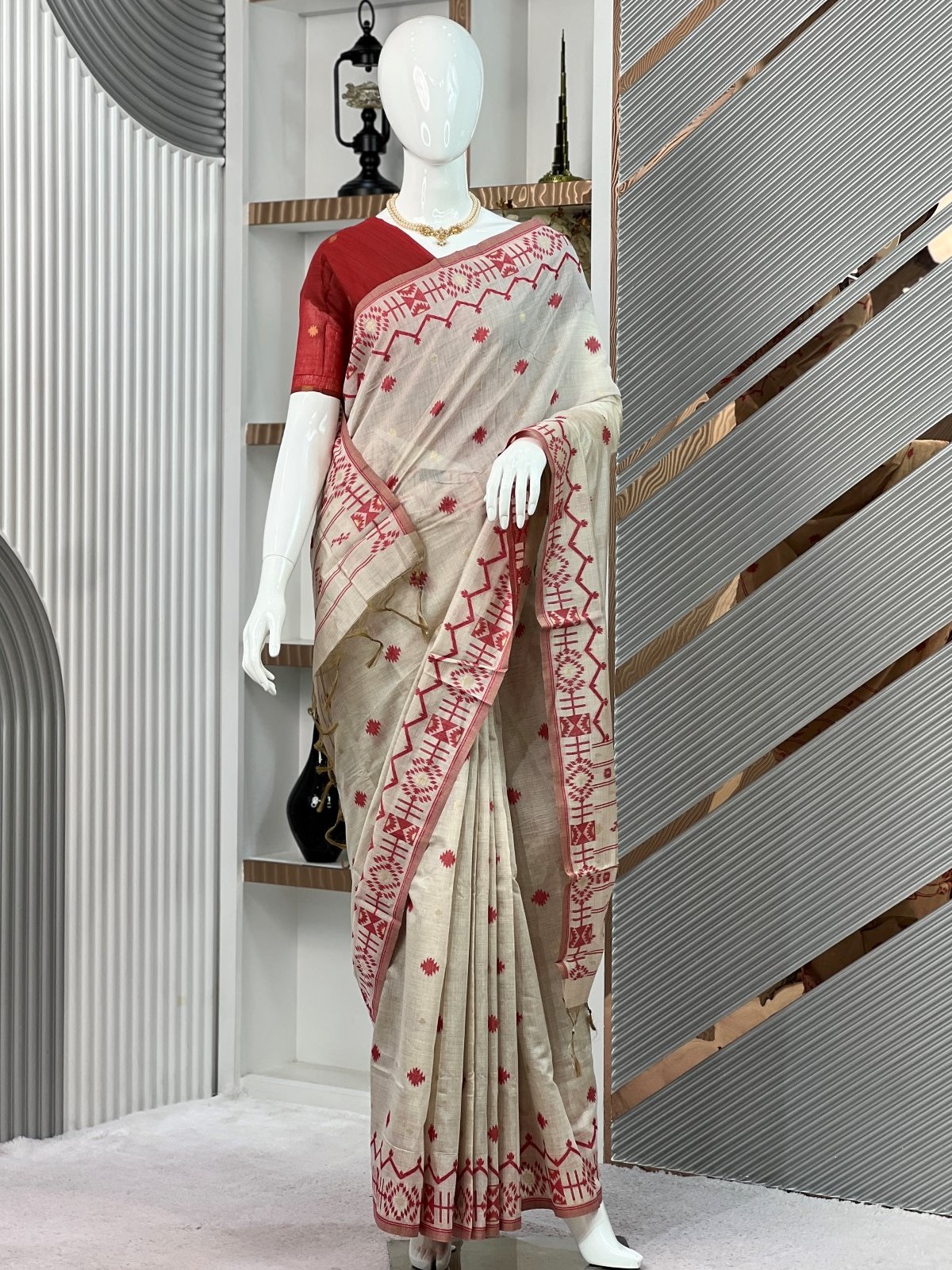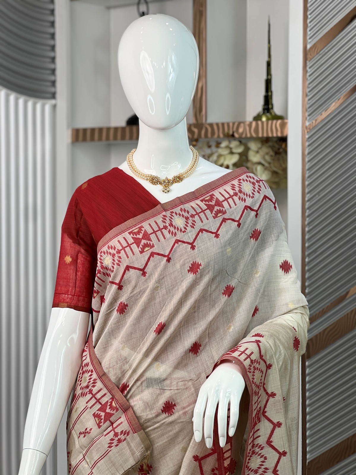 Woven with care and tradition, this saree blends the timeless charm of Jamdani design with the breathability of linen fabric. Lightweight and elegant, it’s ideal for day-long wear, whether it’s a cultural program, festive gathering, or office event. Comes with a matching blouse piece for a complete, refined look.