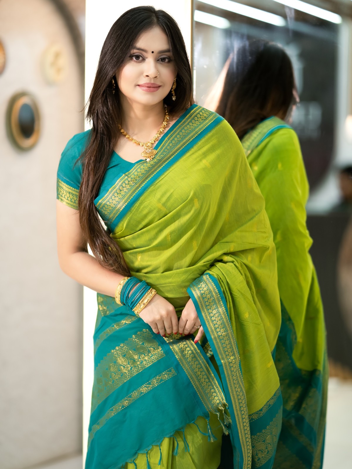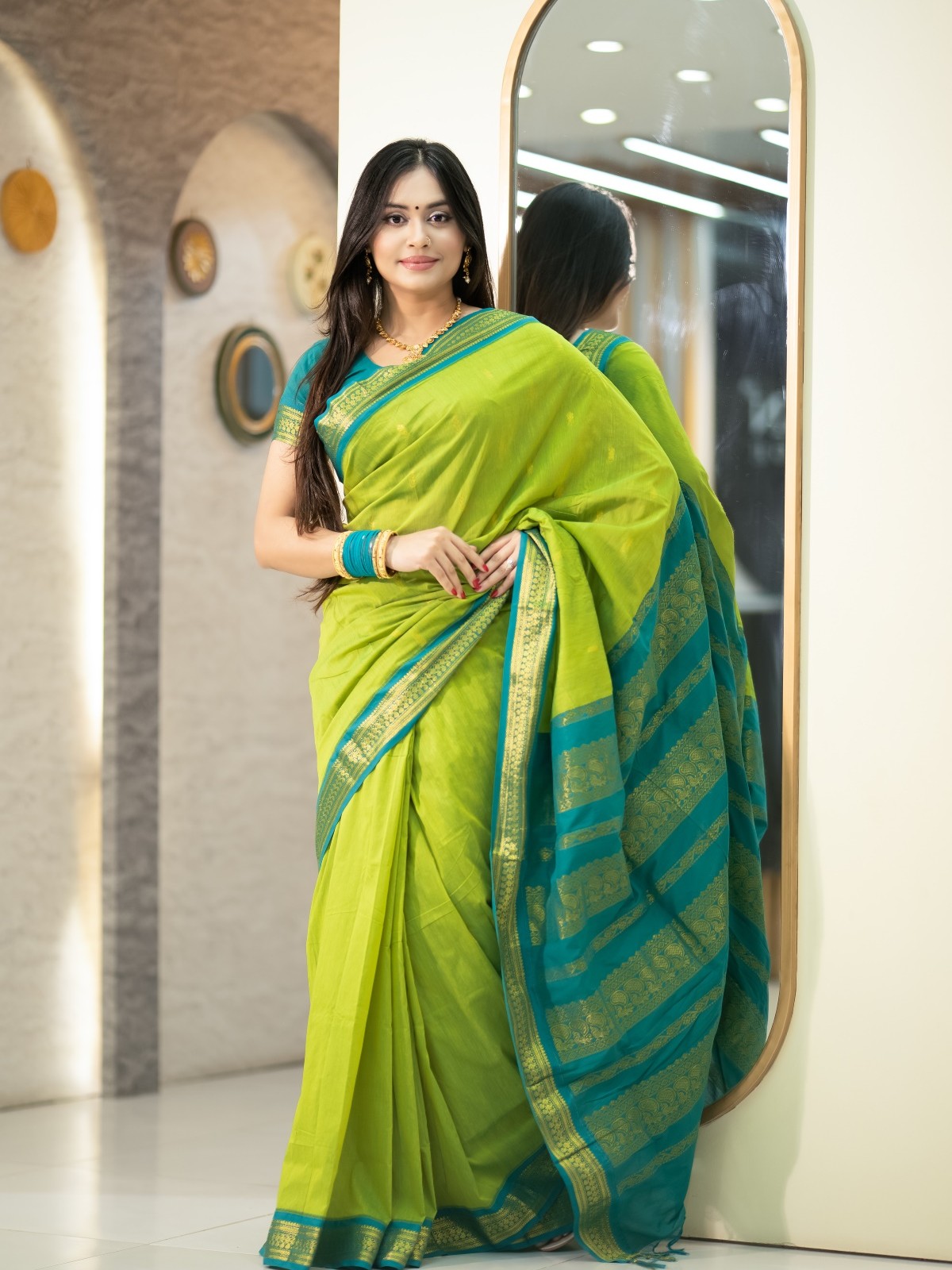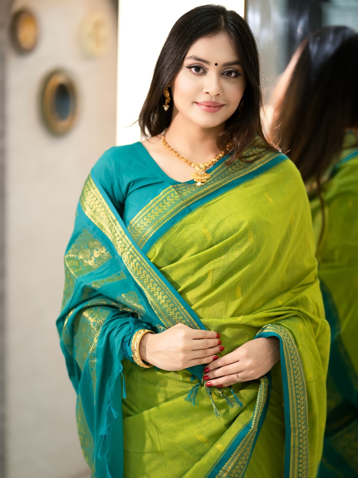 Expertly woven with a unique blend of silk and cotton, this saree offers both the shine of silk and the comfort of cotton. Its graceful drape and ligh...