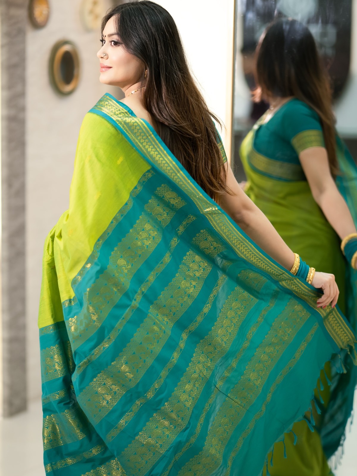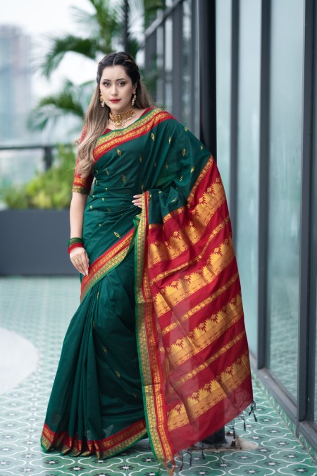 Expertly woven with a unique blend of silk and cotton, this saree offers both the shine of silk and the comfort of cotton. Its graceful drape and li...