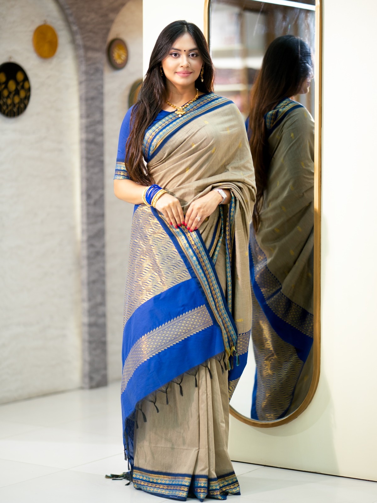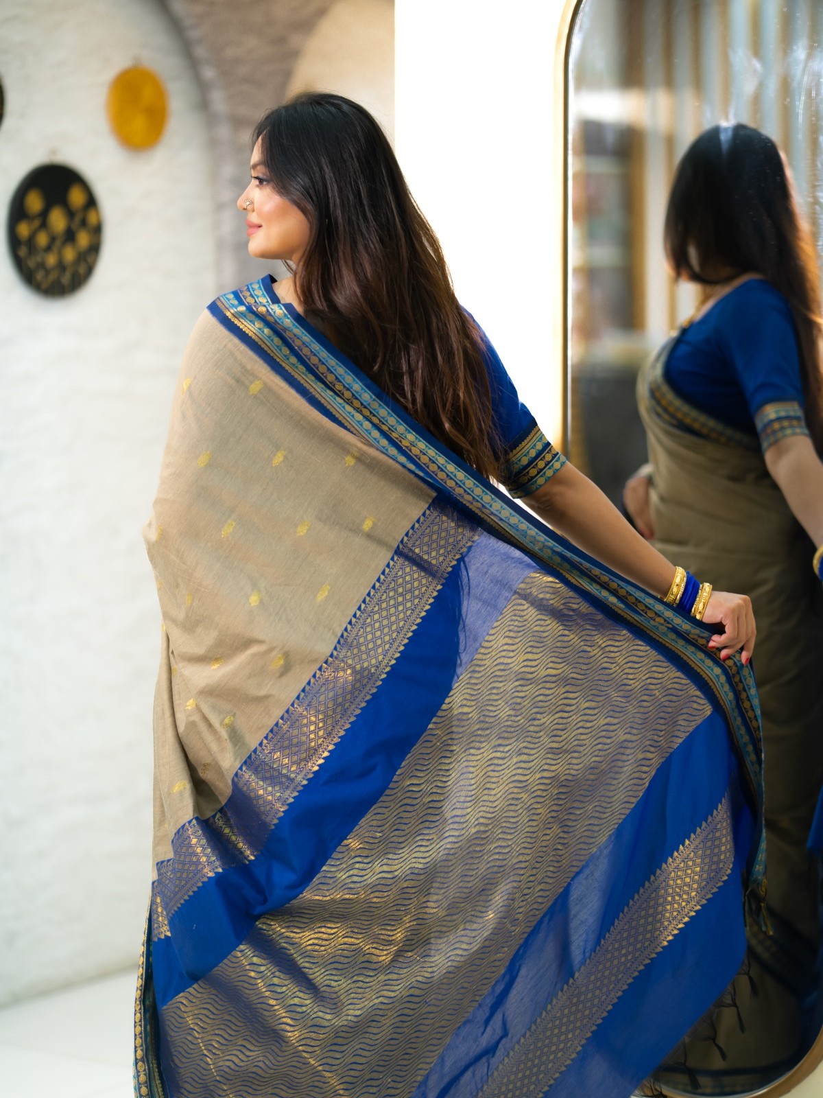Expertly woven with a unique blend of silk and cotton, this saree offers both the shine of silk and the comfort of cotton. Its graceful drape and ligh...