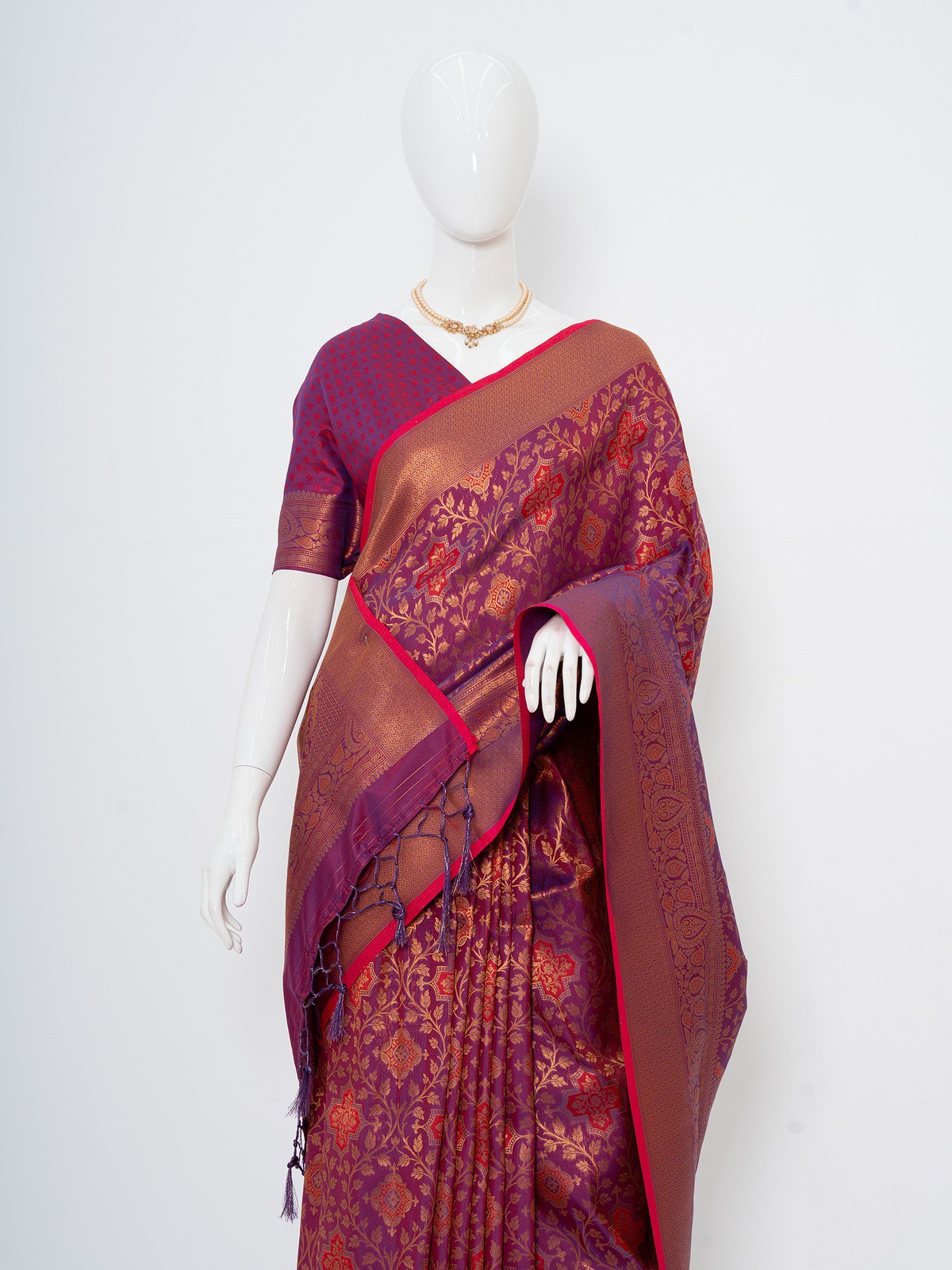 This exquisite Dark Purple Viscose Silk Kashmiri Kani Saree, now available at Dhaka Mart, is a true masterpiece of artisanal brilliance. Woven from pr...