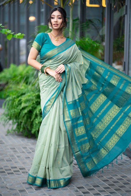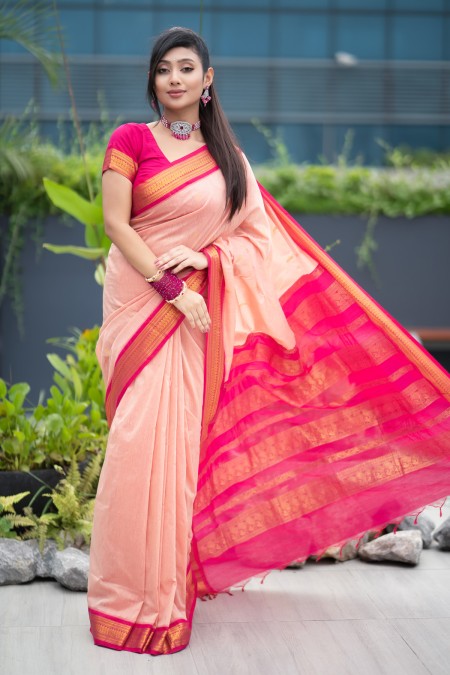 Expertly woven with a unique blend of silk and cotton, this saree offers both the shine of silk and the comfort of cotton. Its graceful drape and ligh...