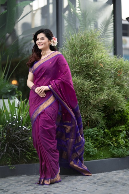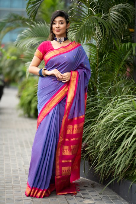 Expertly woven with a unique blend of silk and cotton, this saree offers both the shine of silk and the comfort of cotton. Its graceful drape and li...