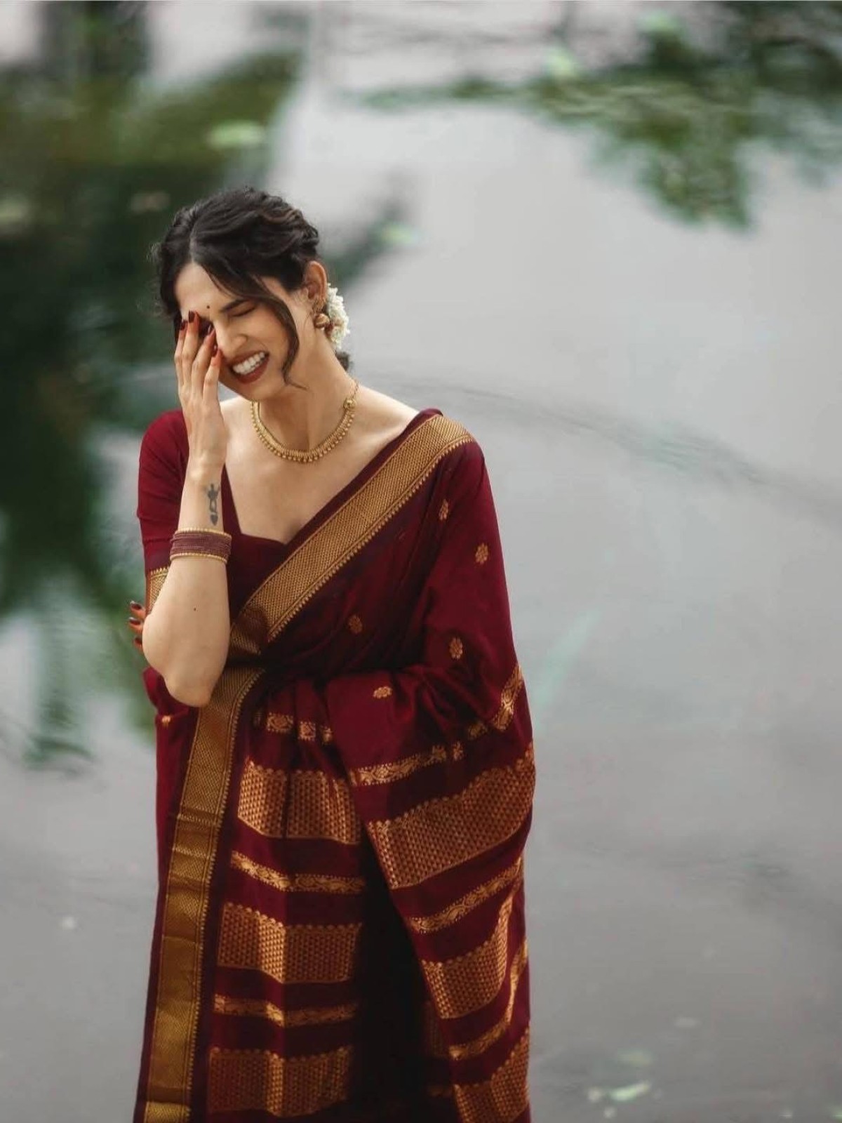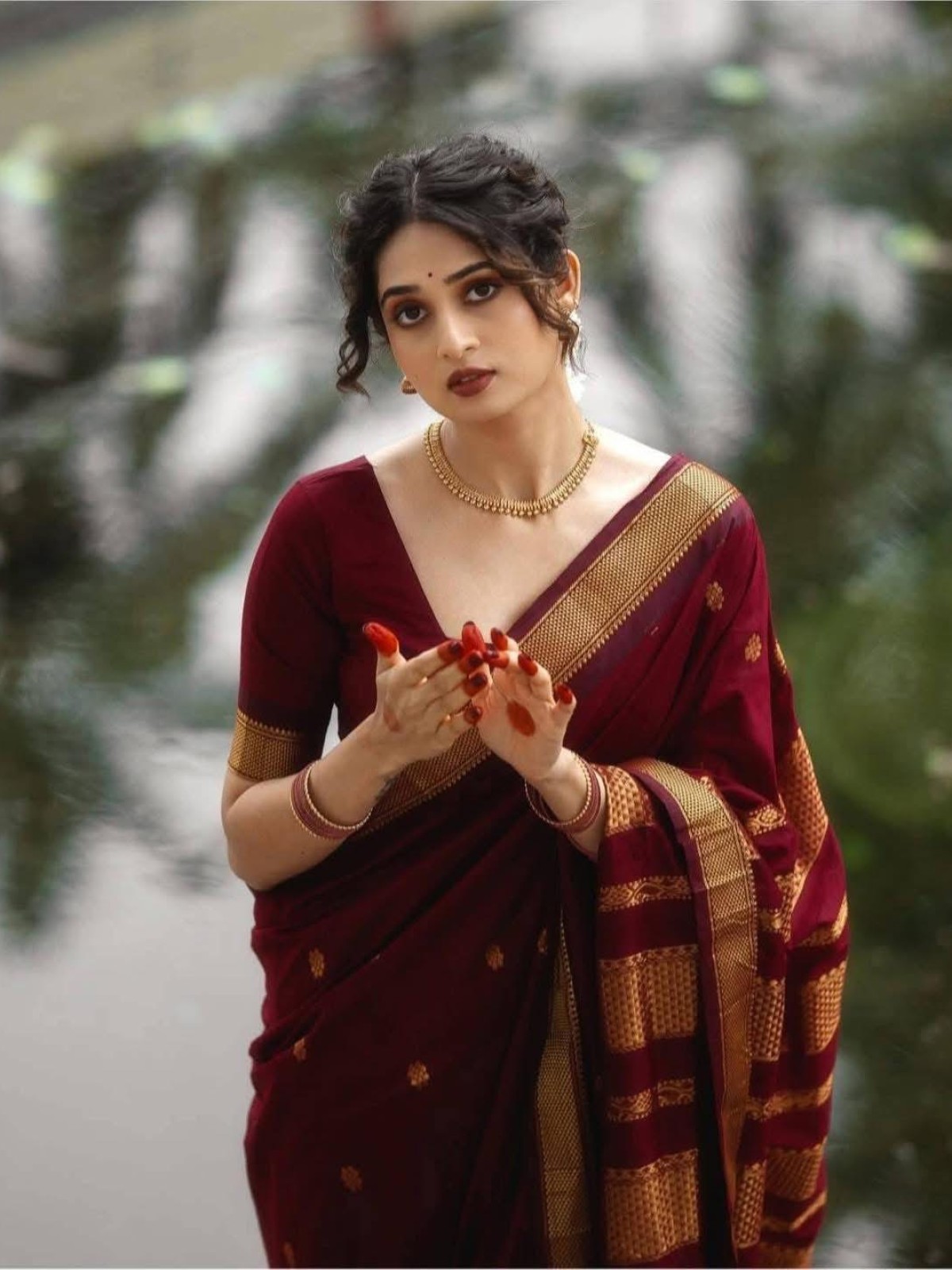Elevate your ethnic wardrobe with this vibrant Maroon Half Silk Inspired Gadwal Saree, now available online in Bangladesh at Dhaka Mart. Crafted from half silk, this Inspired Gadwal silk sari blends traditional South Indian elegance with a light, breathable drape that feels comfortable all day. The refreshing maroon shade, paired with a rich contrasting border, makes it an ideal choice for festive celebrations or weddings. Lightweight yet luxurious in appearance, this gadwal shari is designed for effortless wear and comes with a matching unstitched blouse piece.