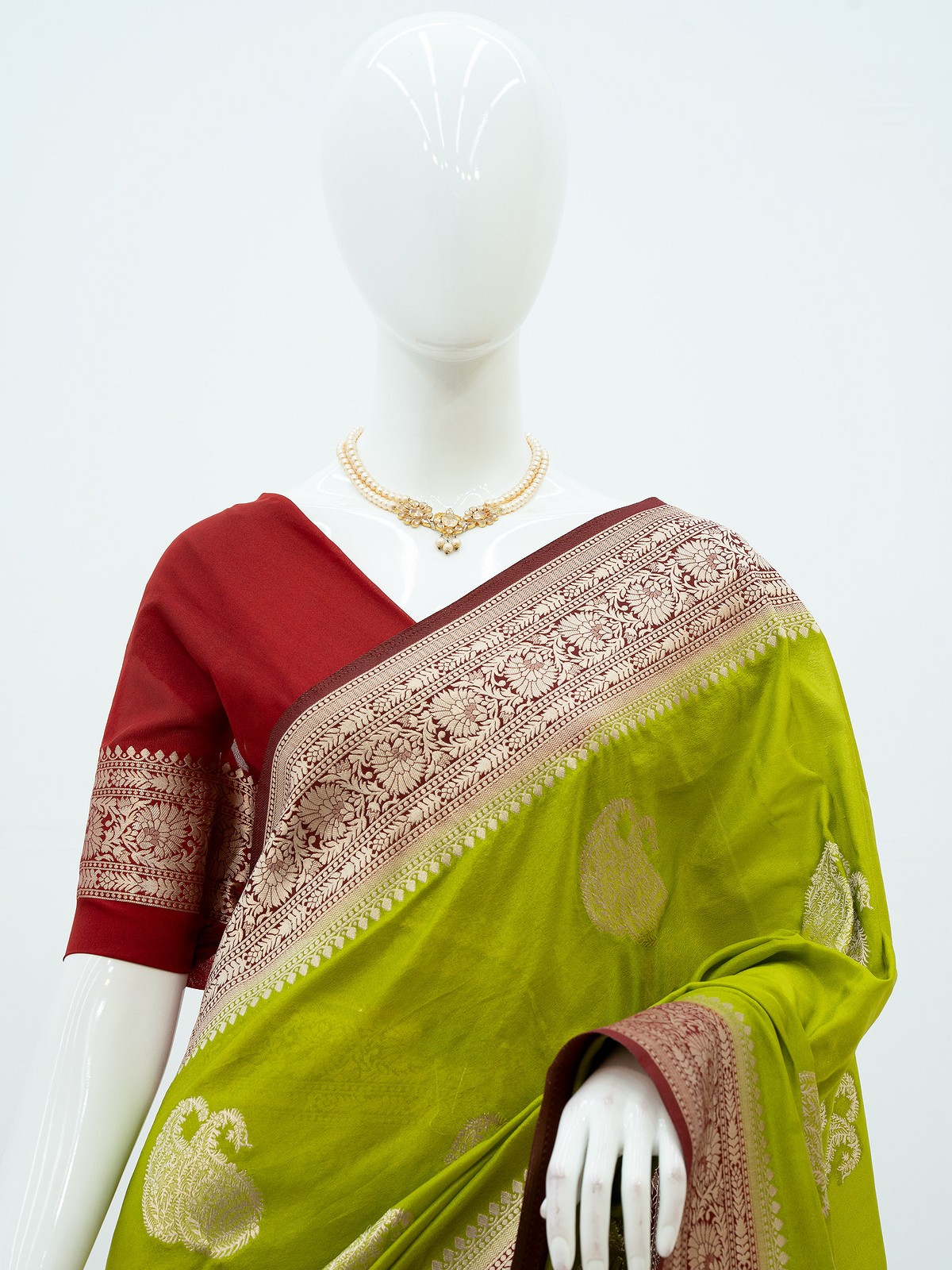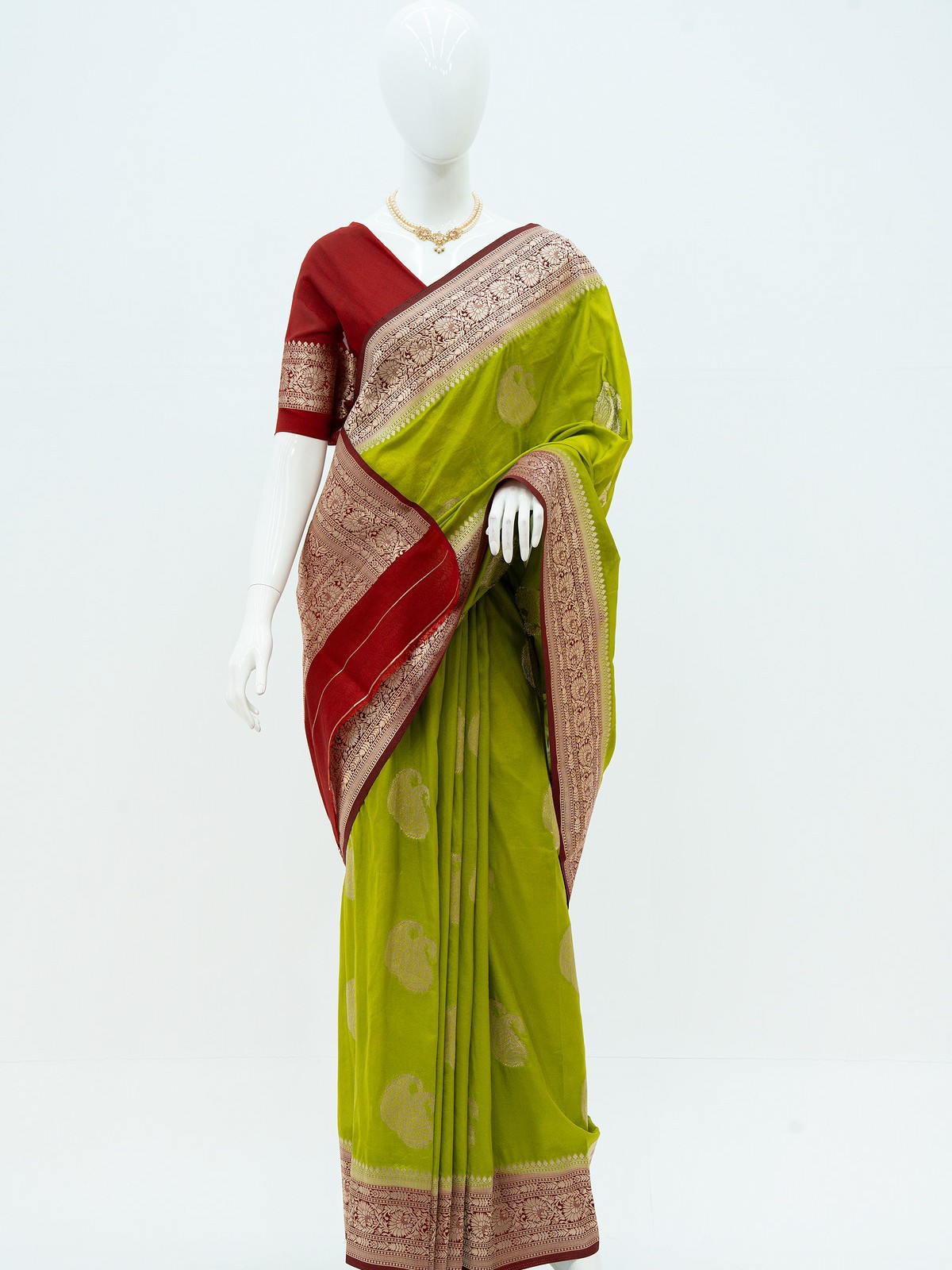 Shop this Parrot Green Silk Georgette Khaddi Sari online in Bangladesh at Dhaka Mart. Crafted from silk georgette, this Khaddi saree feels smooth, silky, lightweight, and beautifully textured, making it an ideal choice for weddings, festive occasions, cultural events, or everyday elegance. It comes with the same unstitched blouse piece shown in the photo, allowing you to style your look as you prefer.
