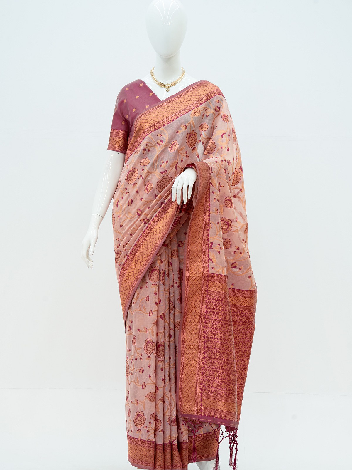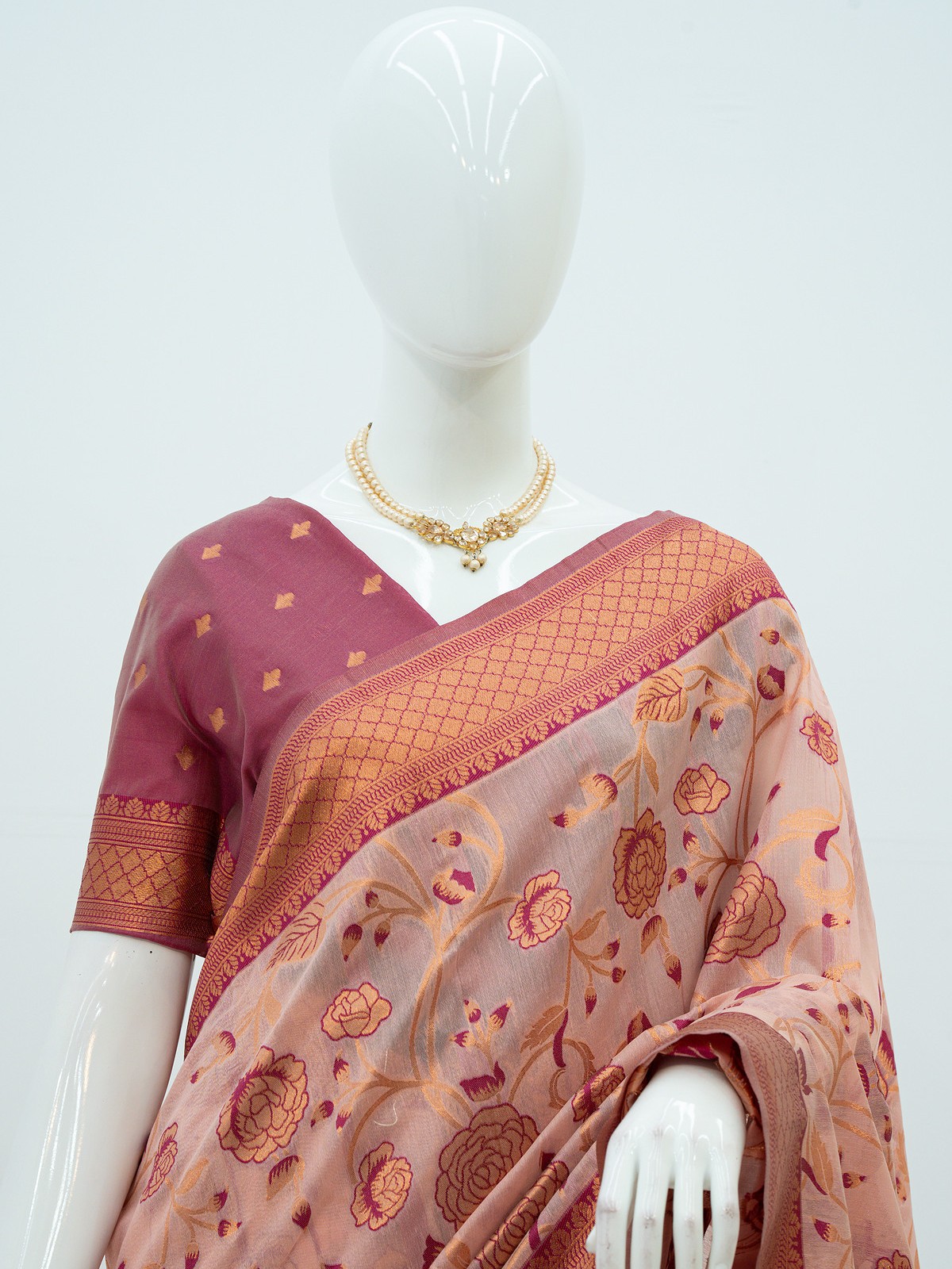 Shop this stunning Peachy Pink Tussar Silk Kanchipuram Saree online in Bangladesh, exclusively at Dhaka Mart. Crafted from authentic Kanchipuram silk, this bestselling saree offers a luxuriously smooth drape and a timeless traditional look that turns heads at every wedding and festive occasion. The peachy pink hue radiates elegance under any light. Comes with a matching unstitched blouse piece. Style it your way. Limited stock available. Order now and enjoy hassle-free delivery across Bangladesh.
