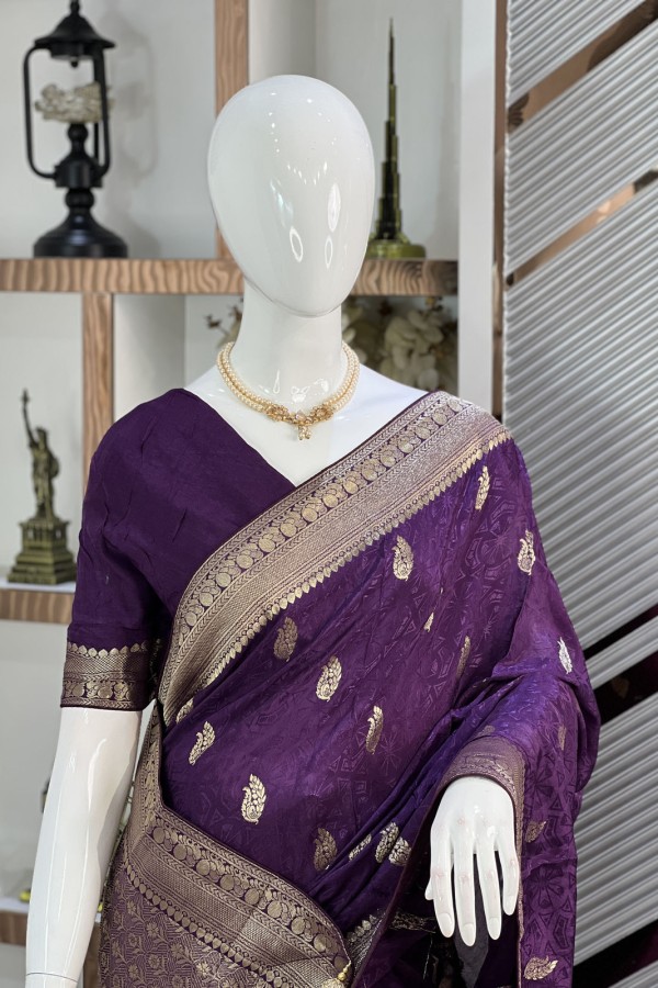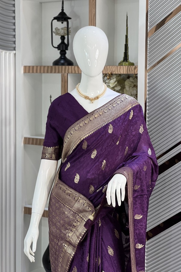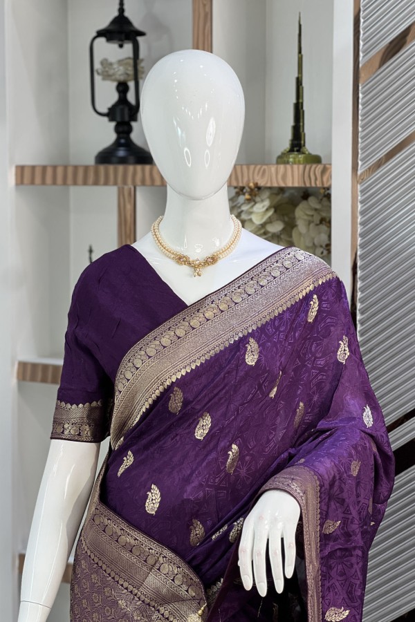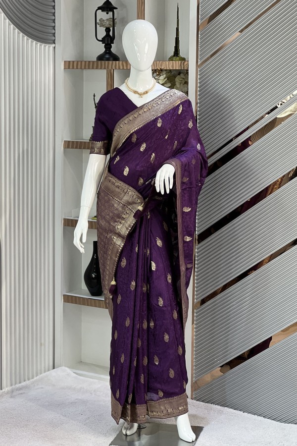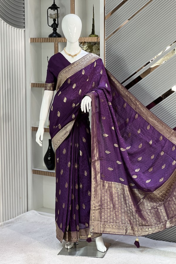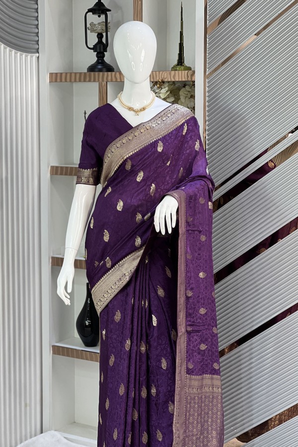 This exquisite Dark Purple Viscose Silk Kashmiri Kani Saree, now available at Dhaka Mart, is a true masterpiece of artisanal brilliance. Woven from pr...